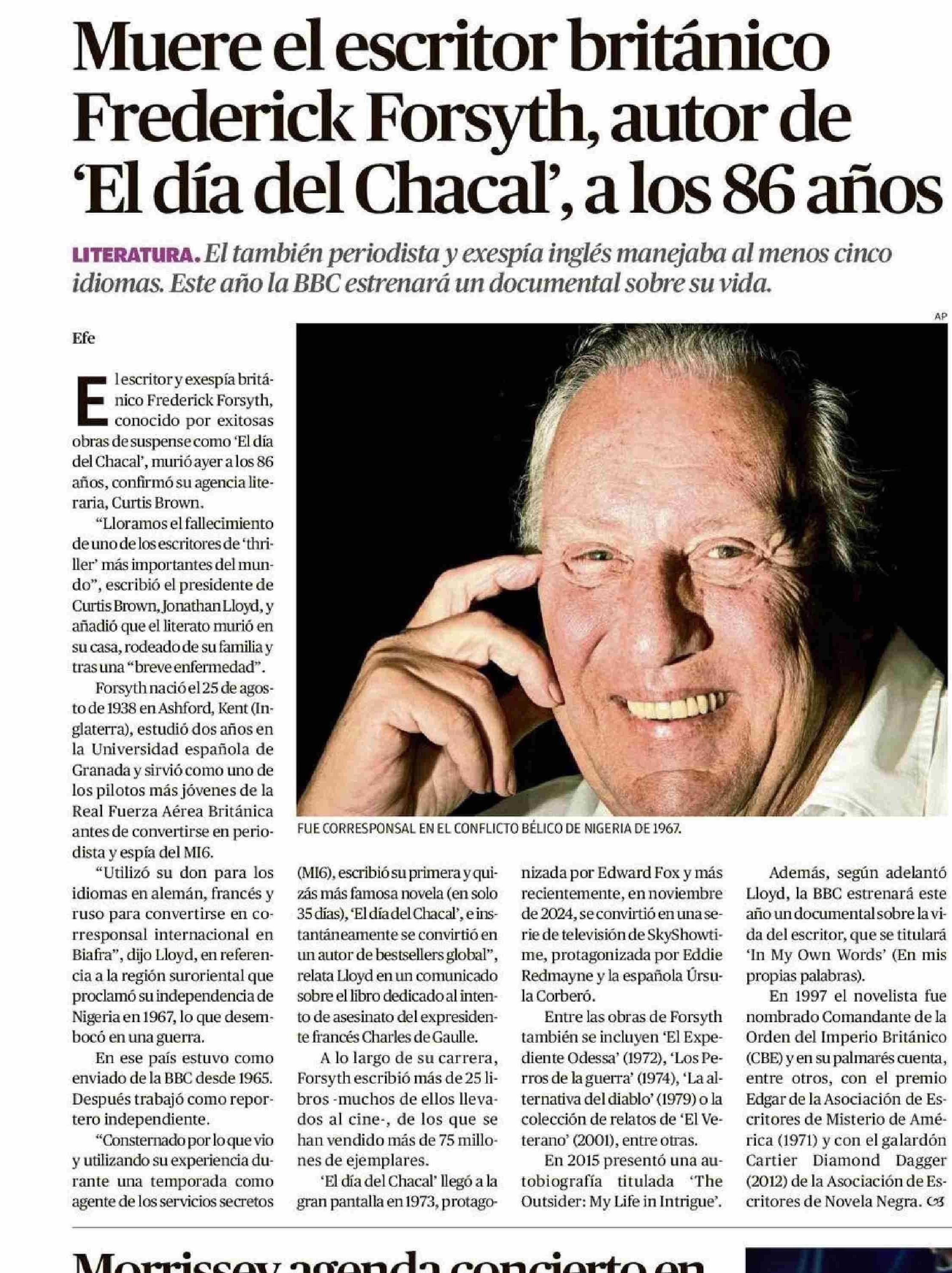 Muere el escritor británico Frederick Forsyth, autor de “El día del Chacal” a los 86 años