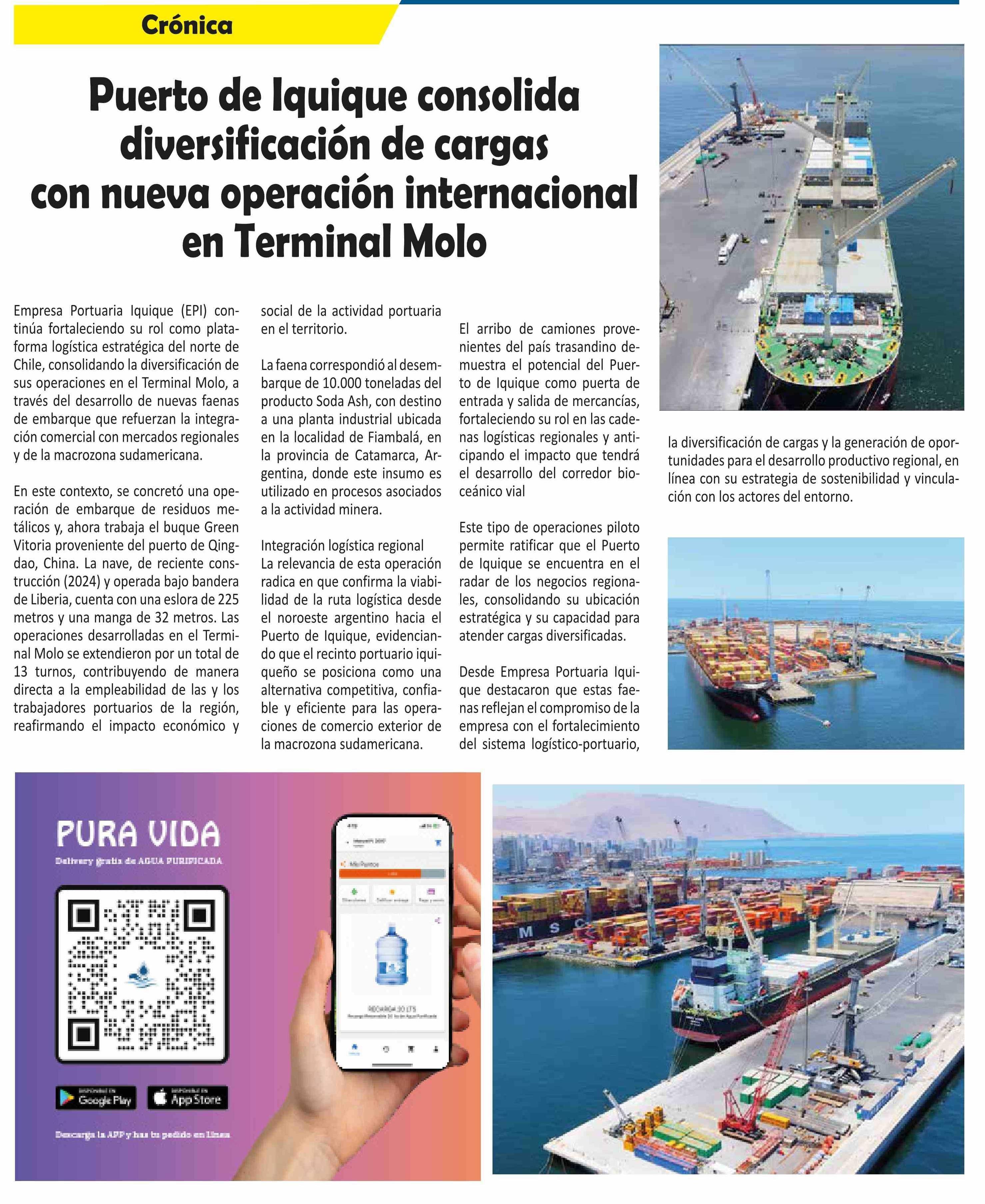Puerto de Iquique consolida diversificación de cargas con nueva operación internacional en Terminal Molo