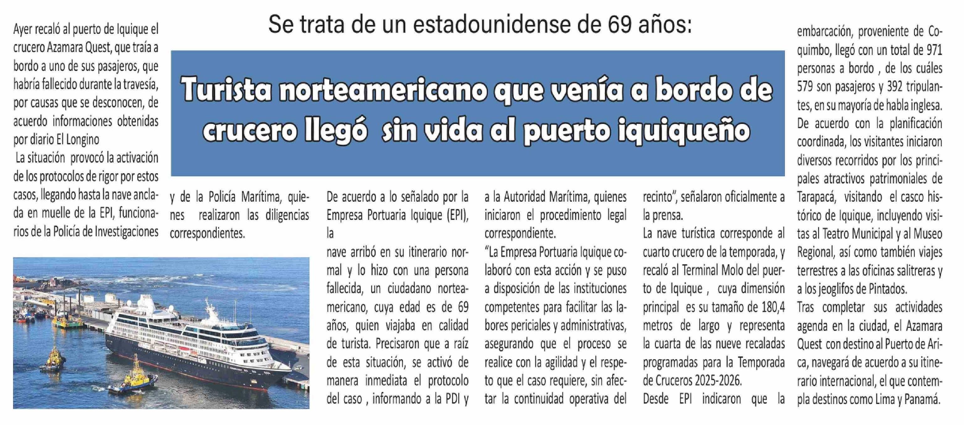 Turista norteamericano que venía a bordo de crucero llegó sin vida al puerto iquiqueño
