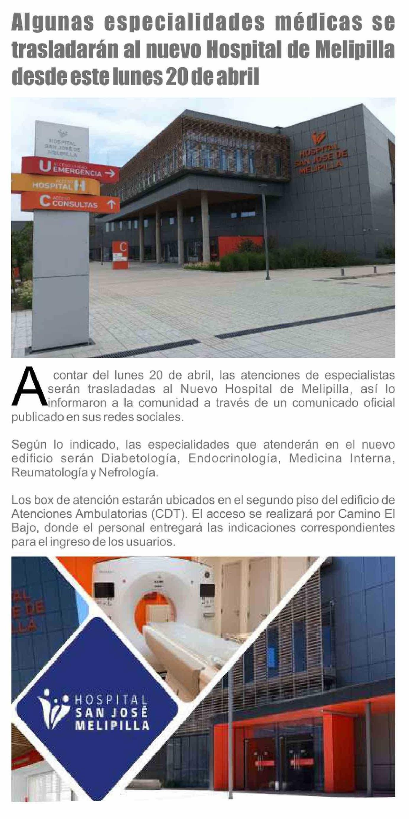 Algunas especialidades médicas se trasladarán al nuevo Hospital de Melipilla desde este lunes 20 de abril
