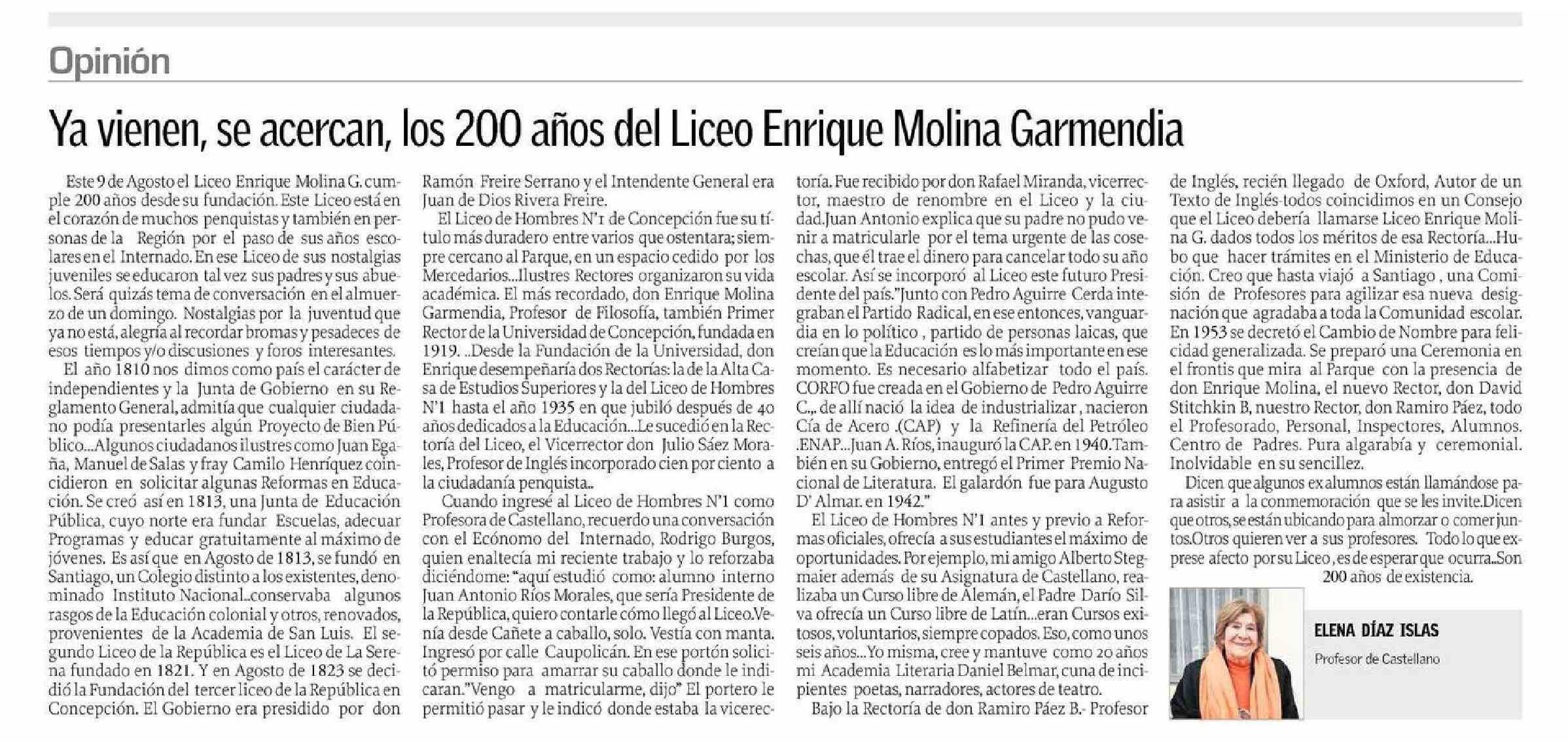 Ya vienen, se acercan, los 200 años del Liceo Enrique Molina Garmendia