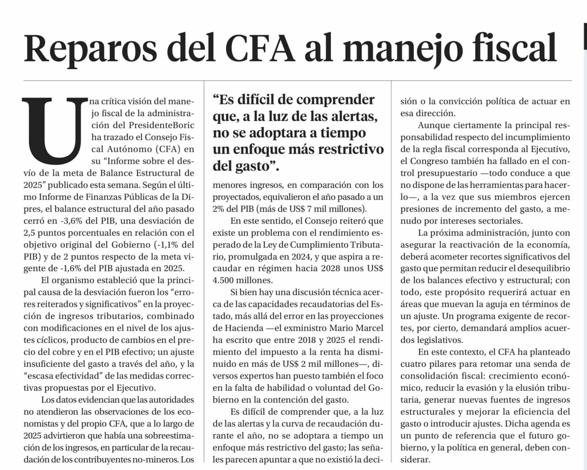 EDITORIAL: Reparos del CFA al manejo fiscal