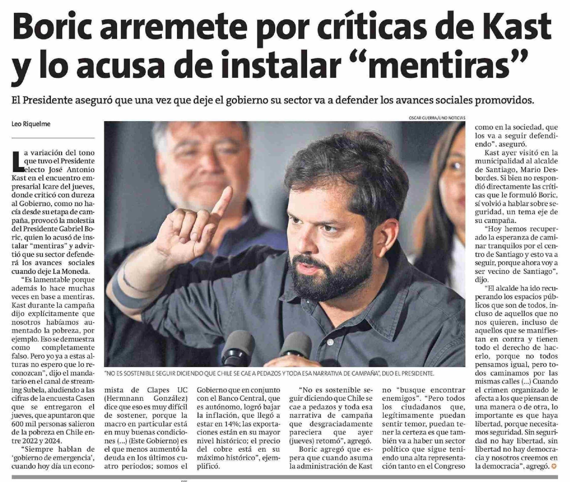 Título: Boric arremete por críticas de Kast y lo acusa de instalar "mentiras"