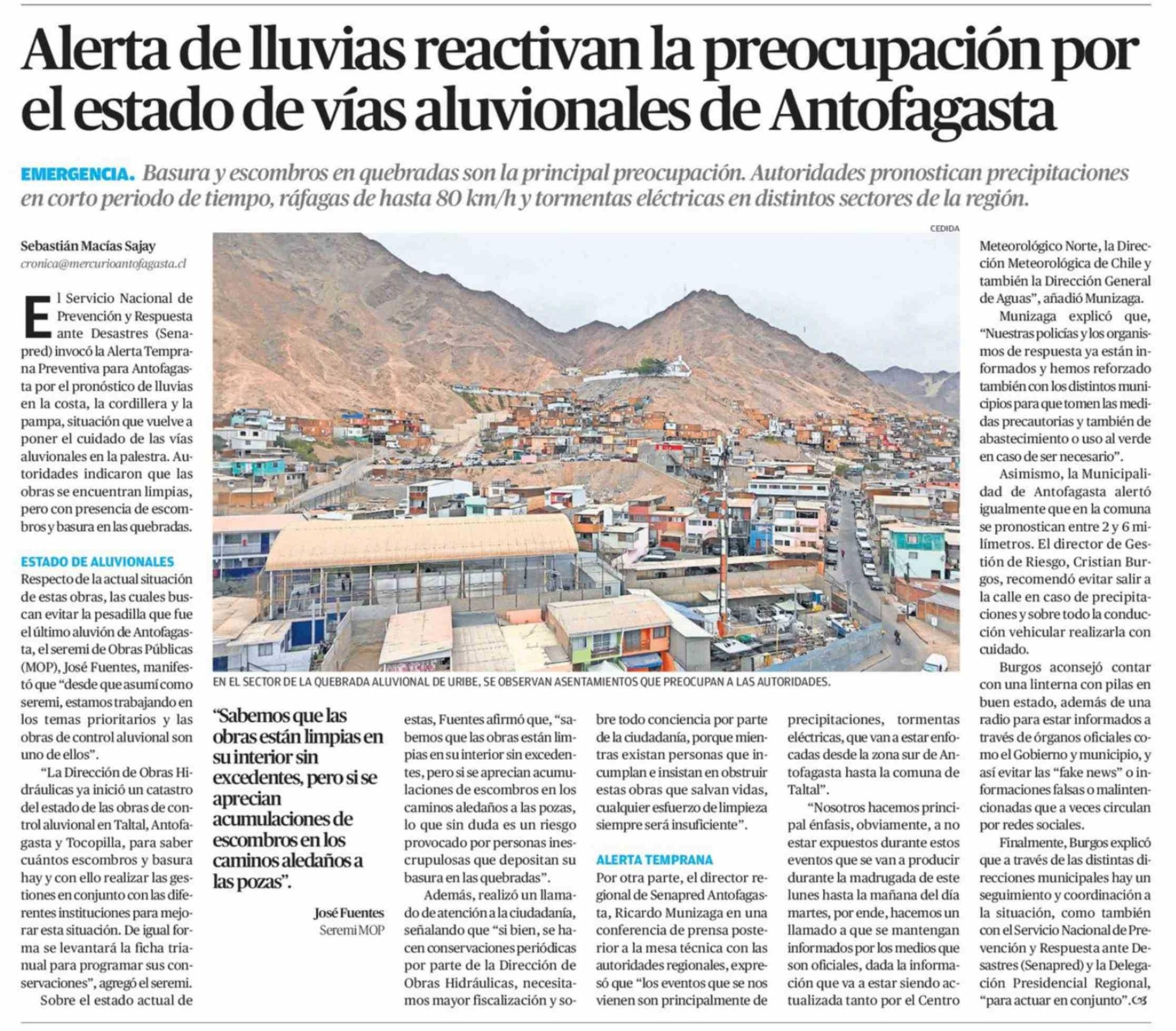 Alerta de lluvias reactivan la preocupación por el estado de vías aluvionales de Antofagasta