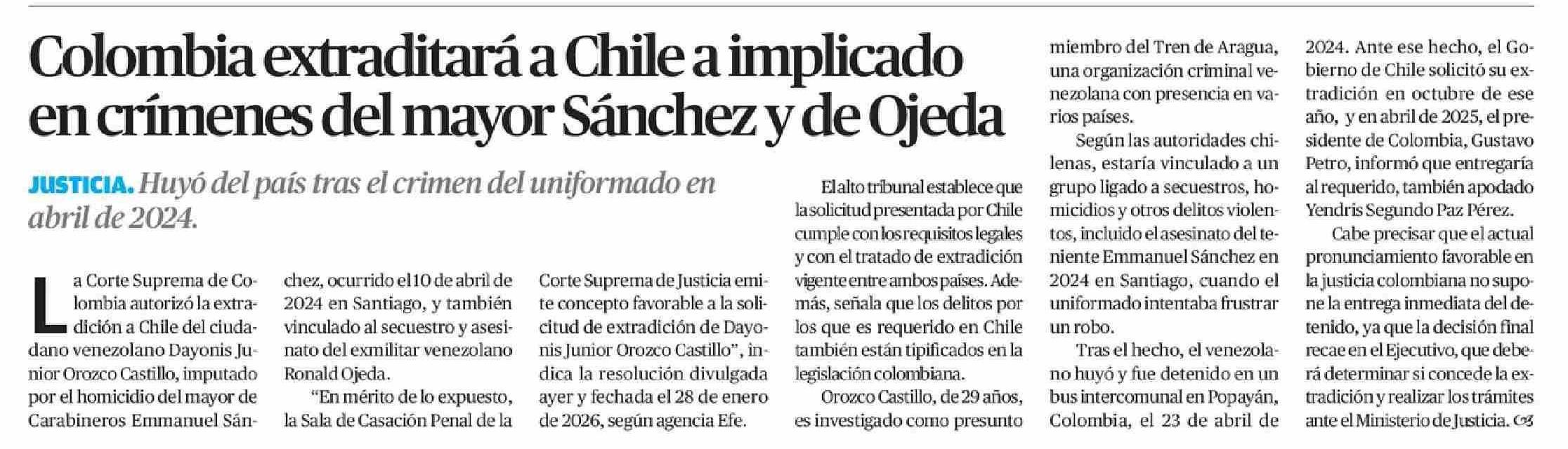 Colombia extraditará a Chile a implicado en crímenes del mayor Sánchez y de Ojeda