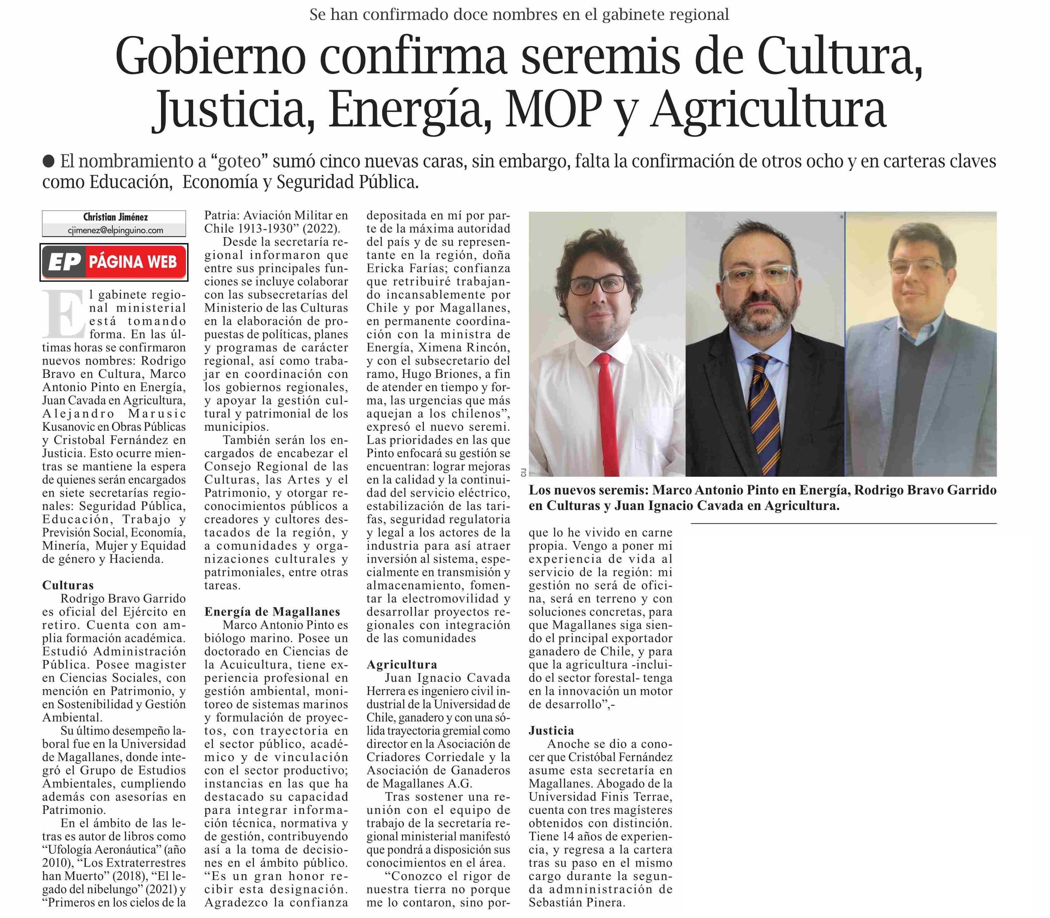 Gobierno confirma seremis de Cultura, Justicia, Energía, MOP y Agricultura