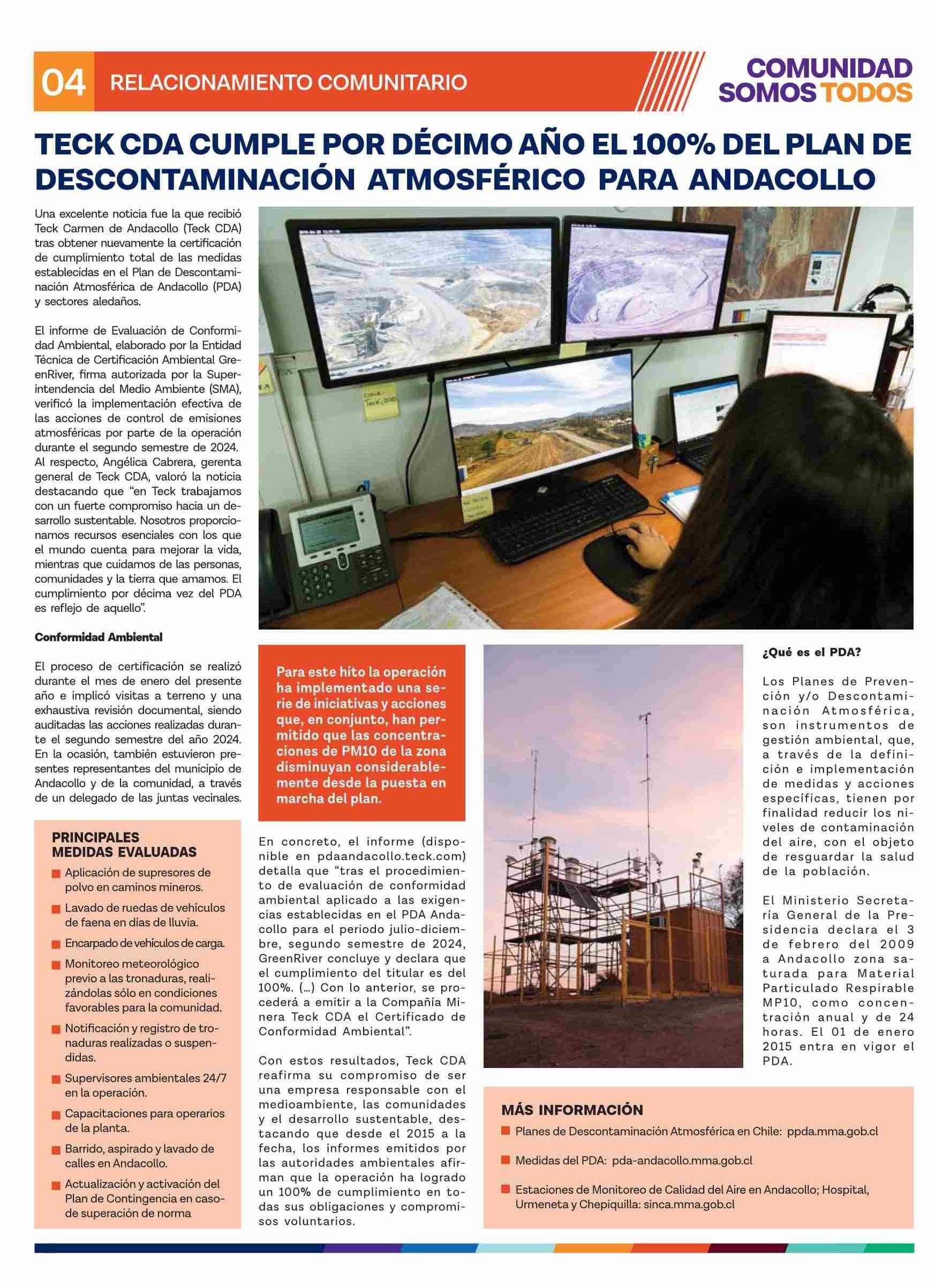 TECK CDA CUMPLE POR DÉCIMO AÑO EL 100% DEL PLAN DE DESCONTAMINACIÓN ATMOSFÉRICO PARA ANDACOLLO