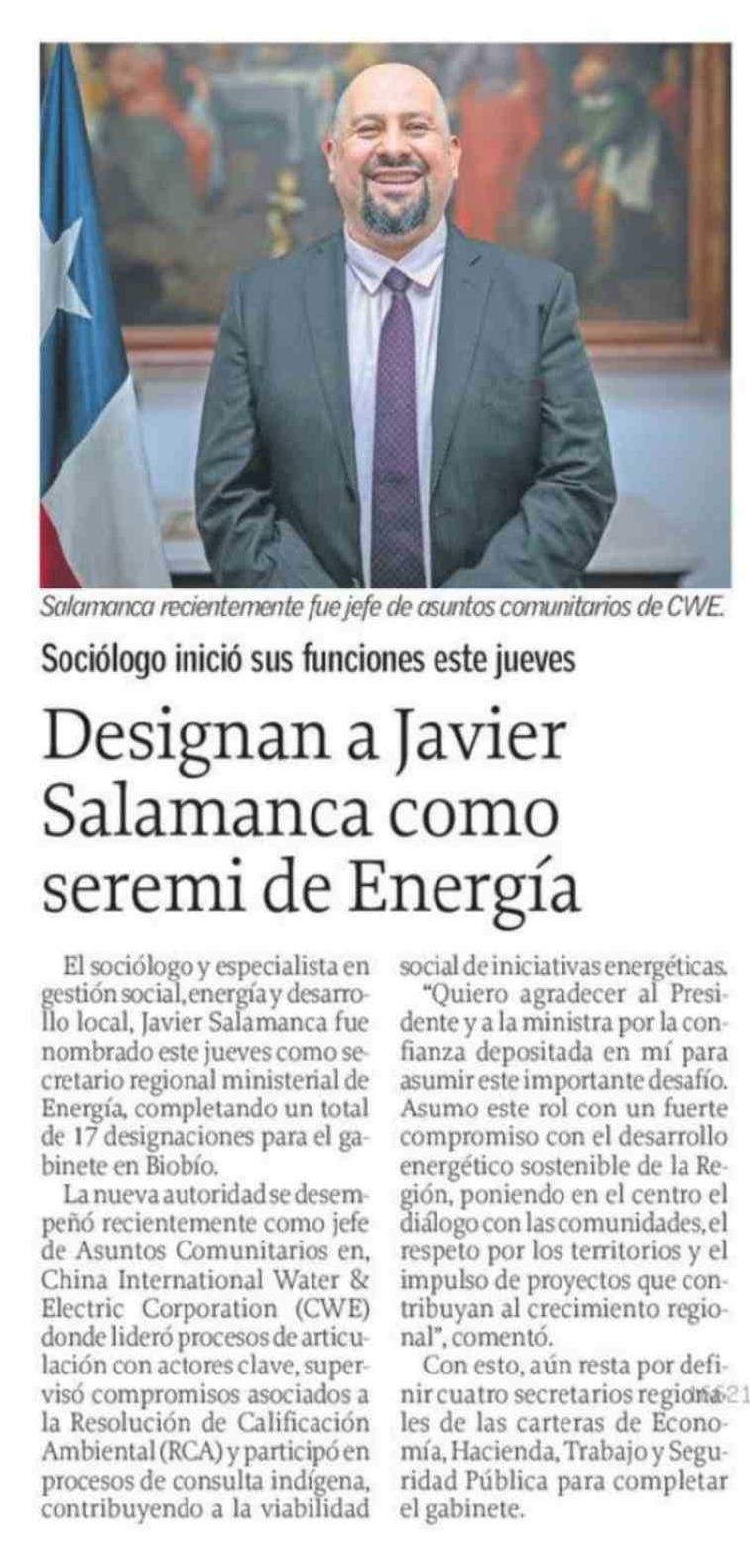 Designan a Javier Salamanca como seremi de Energía