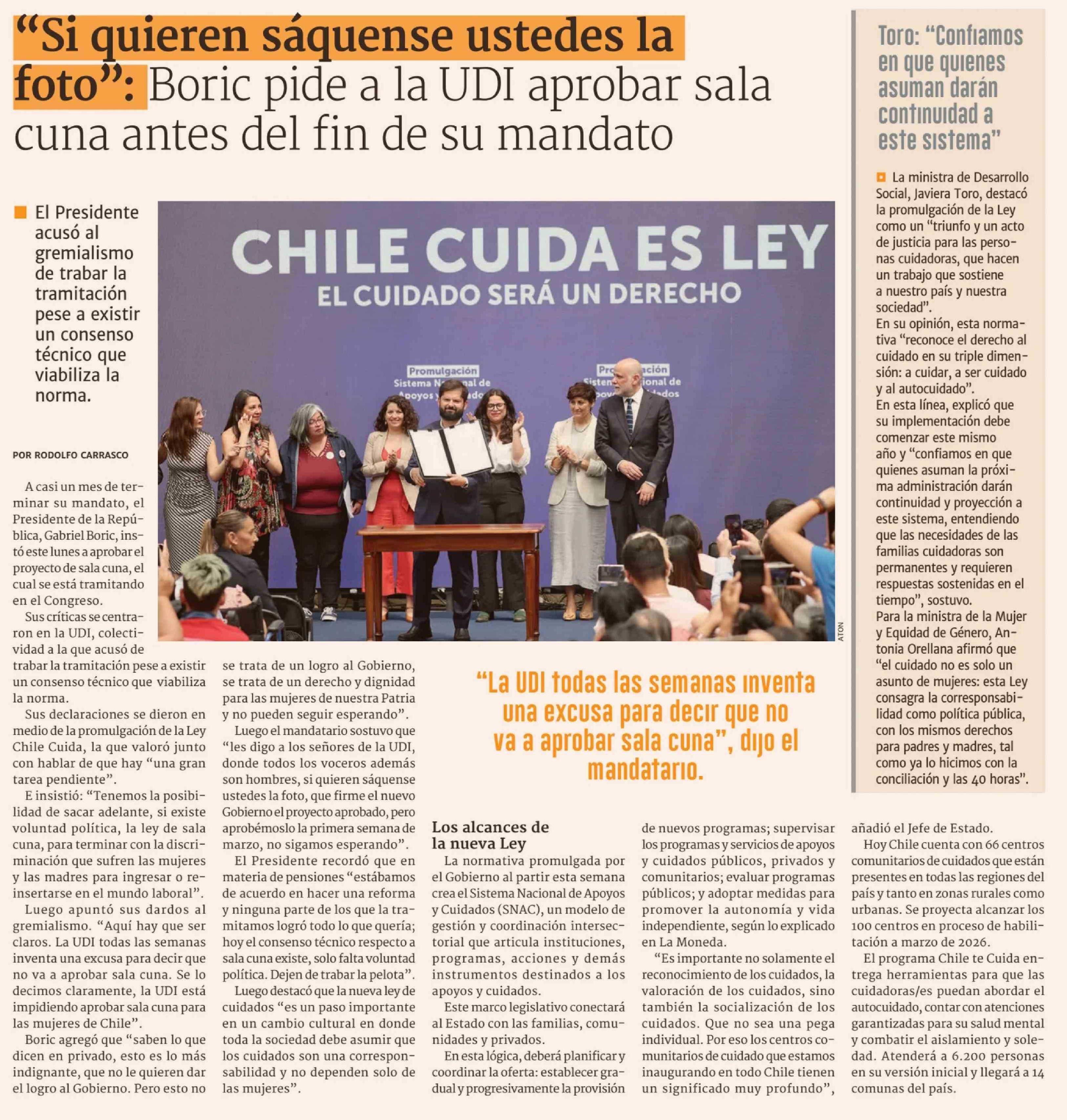 "Si quieren sáquense ustedes la foto": Boric pide a la UDI aprobar sala cuna antes del fin de su mandato