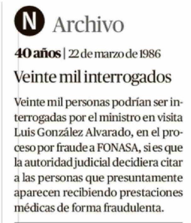 Título: 40 años | 22 de marzo de 1986 Veinte mil interrogados Veinte mil personas podrían ser interrogadas por el ministro en visita Luis González Alvarado, en el proceso por fraude a FONASA, si es que la autoridad judicial decidiera citar a las personas que presuntamente aparecen recibiendo prestaciones mé