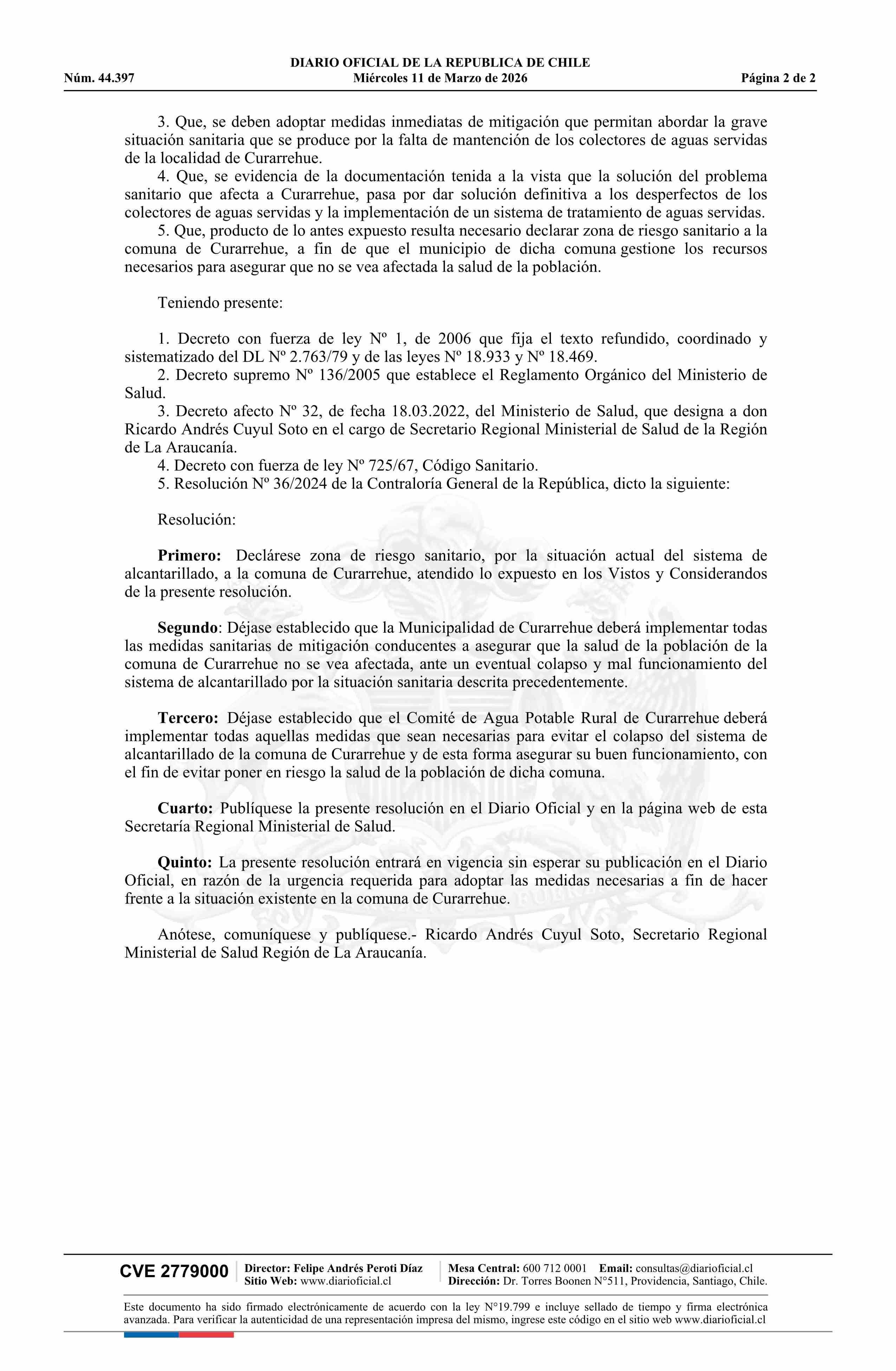 | Título: | Resolución exenta número CP 4.402, de 2026.- Declara zona de riesgo sanitario a la comuna de Curarrehue |