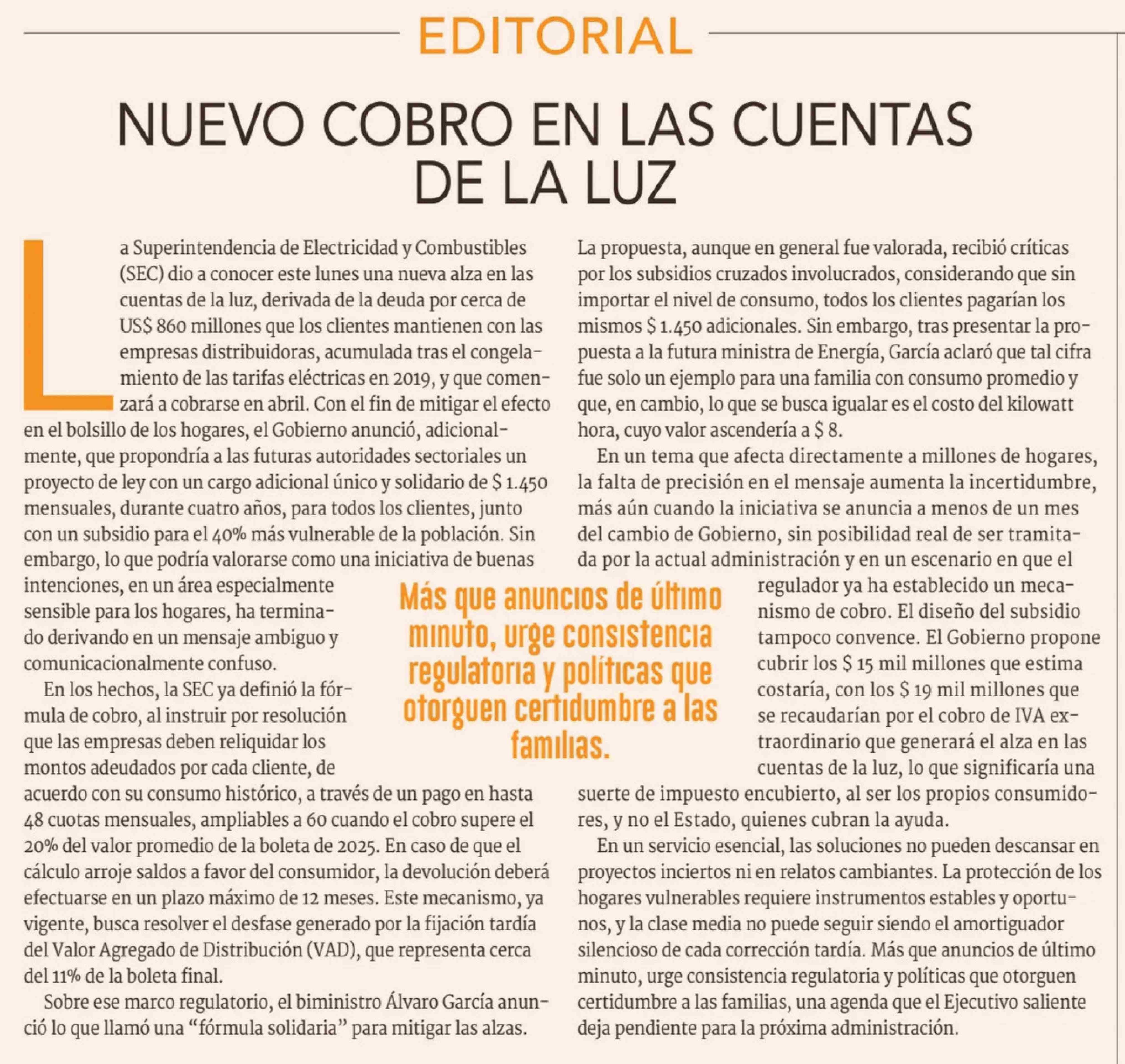 Editorial: NUEVO COBRO EN LAS CUENTAS DE LA LUZ