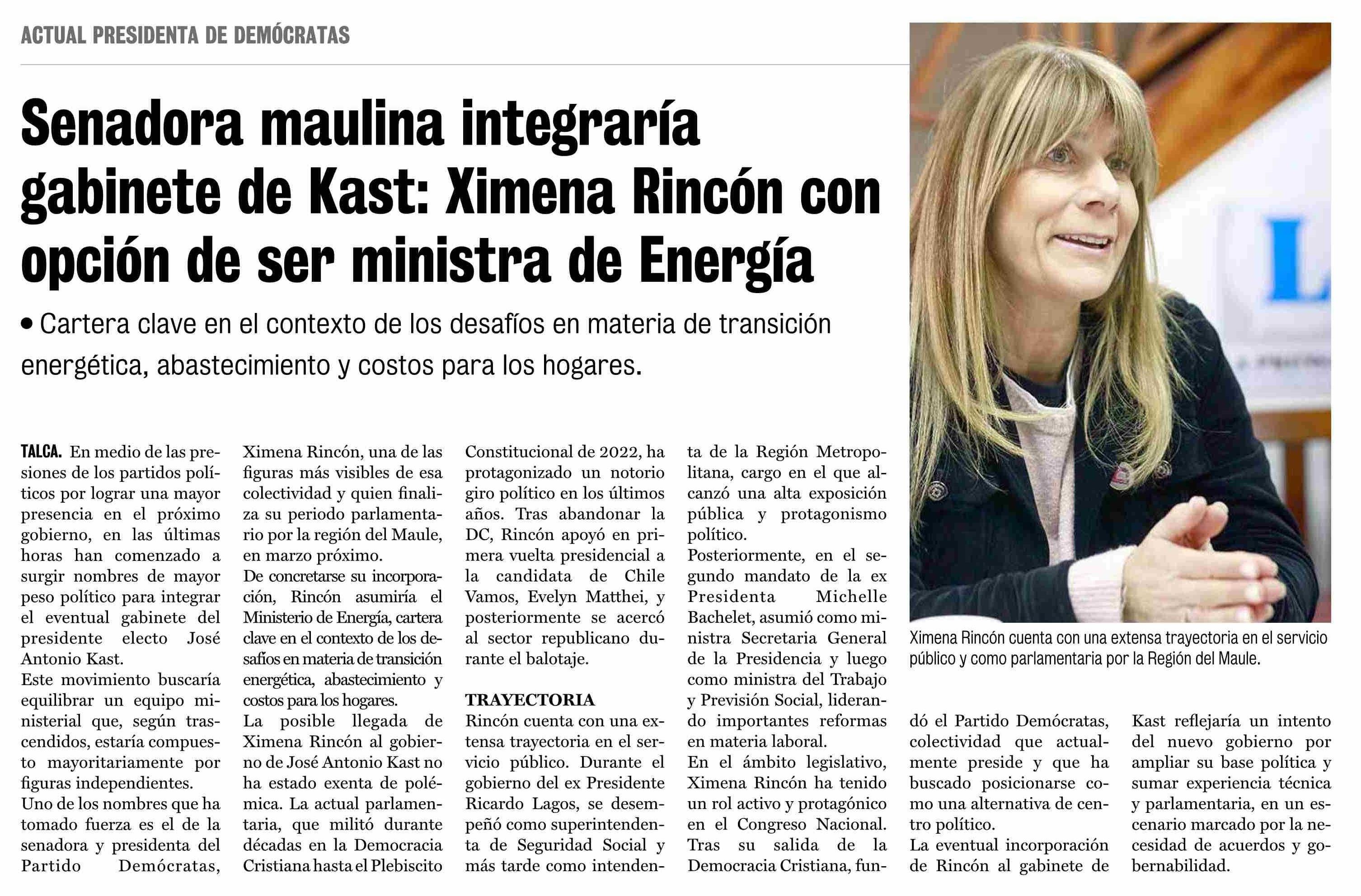 Senadora maulina integraría gabinete de Kast: Ximena Rincón con opción de ser ministra de Energía