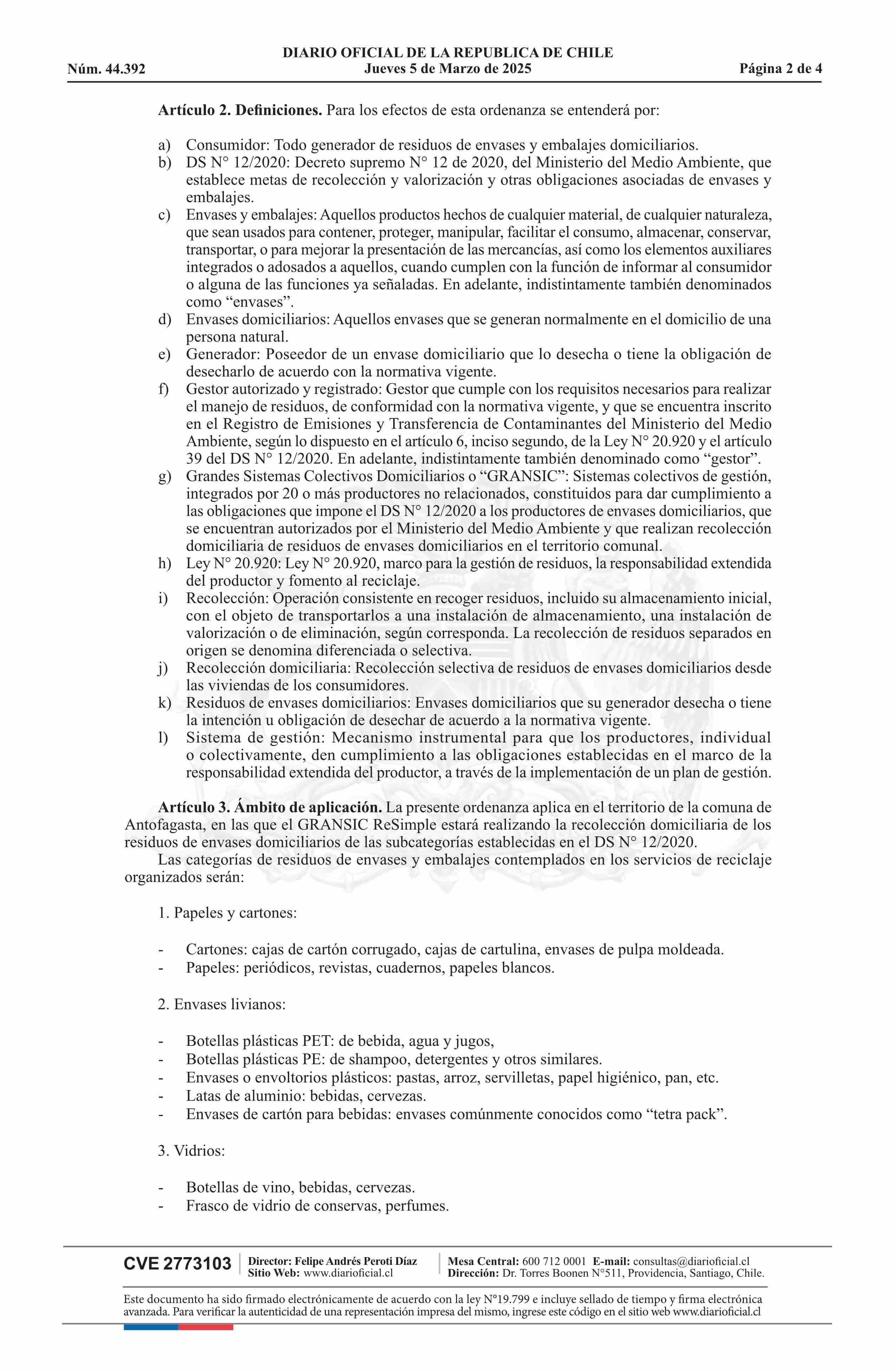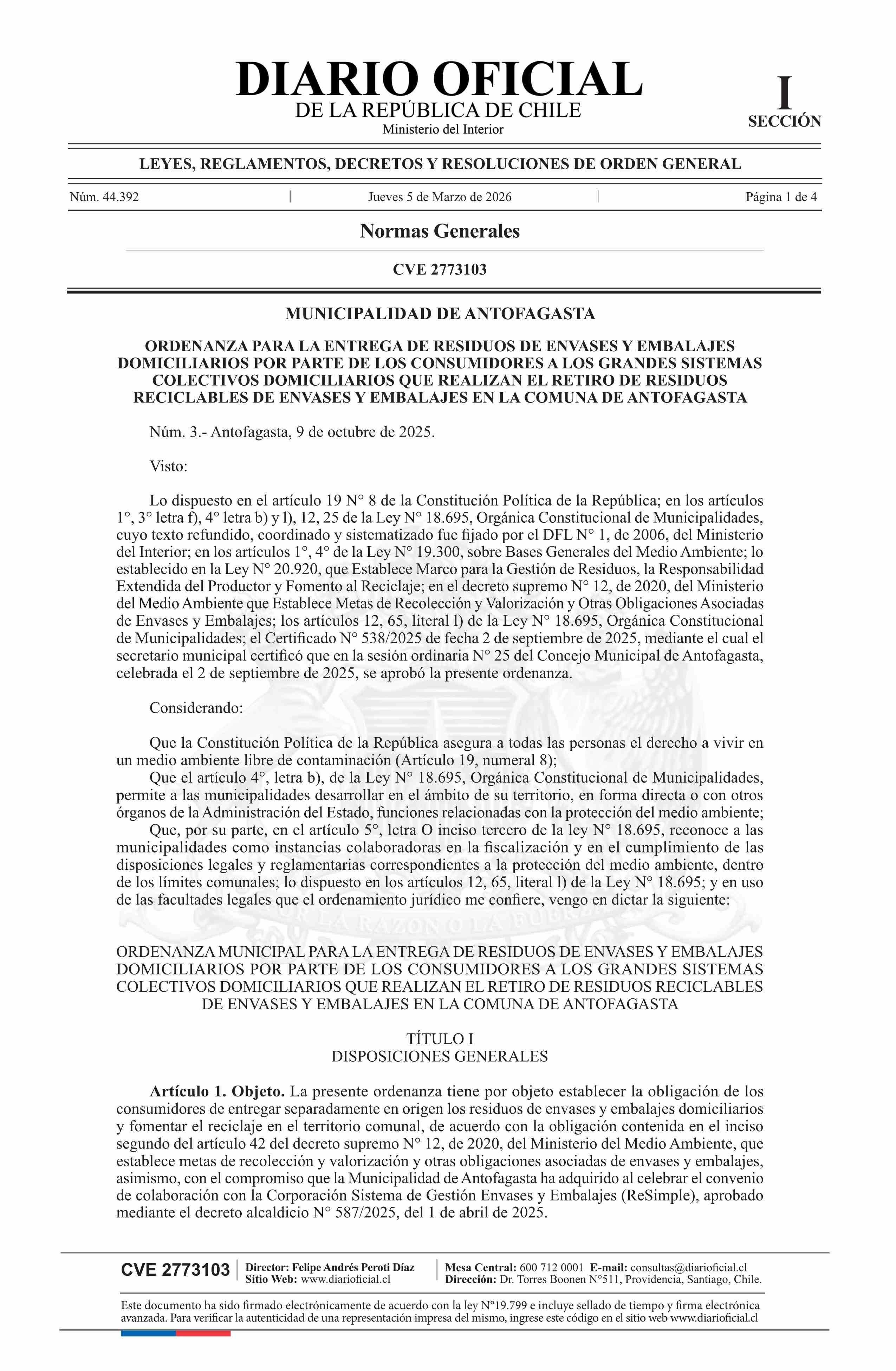 Título: Ordenanza Municipal número 3, de 2025.- Entrega de residuos de envases y embalajes domiciliarios por parte de los consumidores a los grandes sistemas colectivos domiciliarios que realizan el retiro de residuos reciclables de envases y embalajes en la comuna de Antofagasta