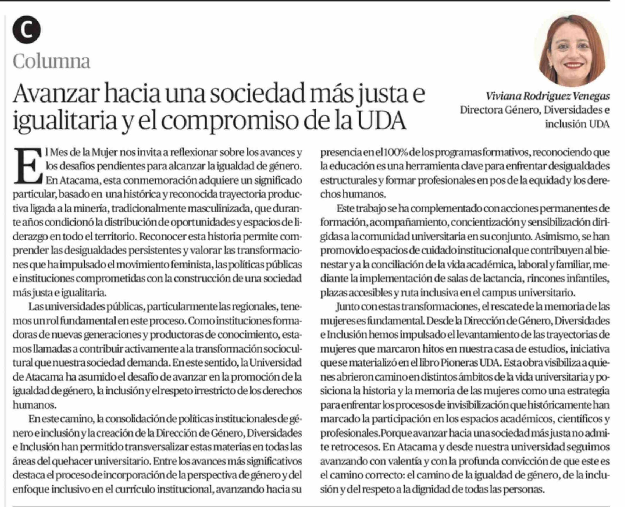 Columnas de Opinión: Avanzar hacia una sociedad más justa e igualitaria y el compromiso de la UDA