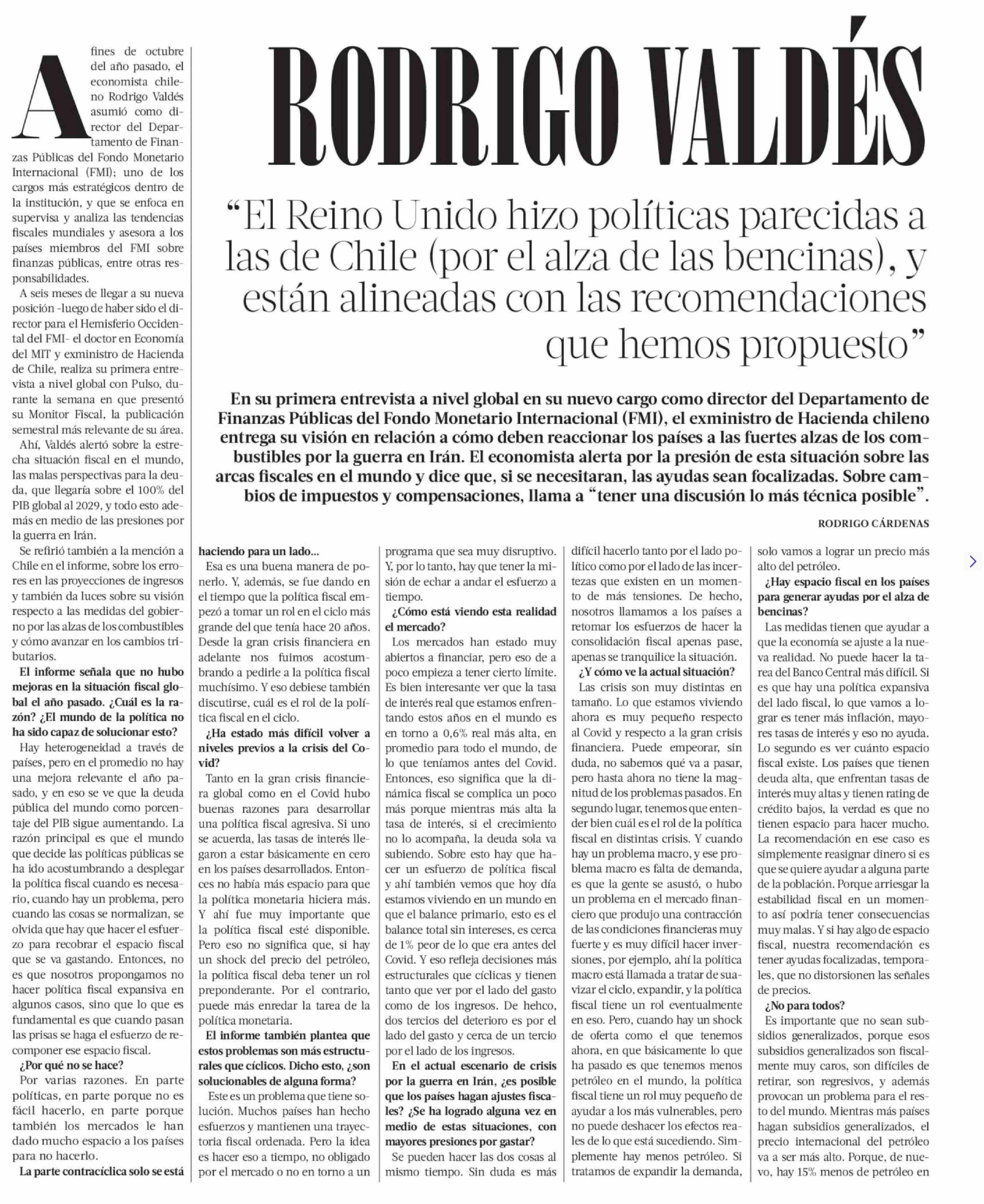 | Título: | RODRIGO VALDÉS "El Reino Unido hizo políticas parecidas a las de Chile (por el alza de las bencinas), y están alineadas con las recomendaciones que hemos propuesto" |