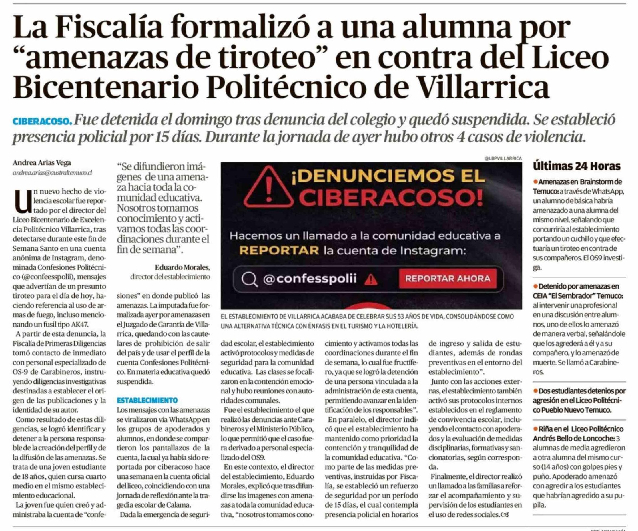 La Fiscalía formalizó a una alumna por "amenazas de tiroteo" en contra del Liceo Bicentenario Politécnico de Villarrica