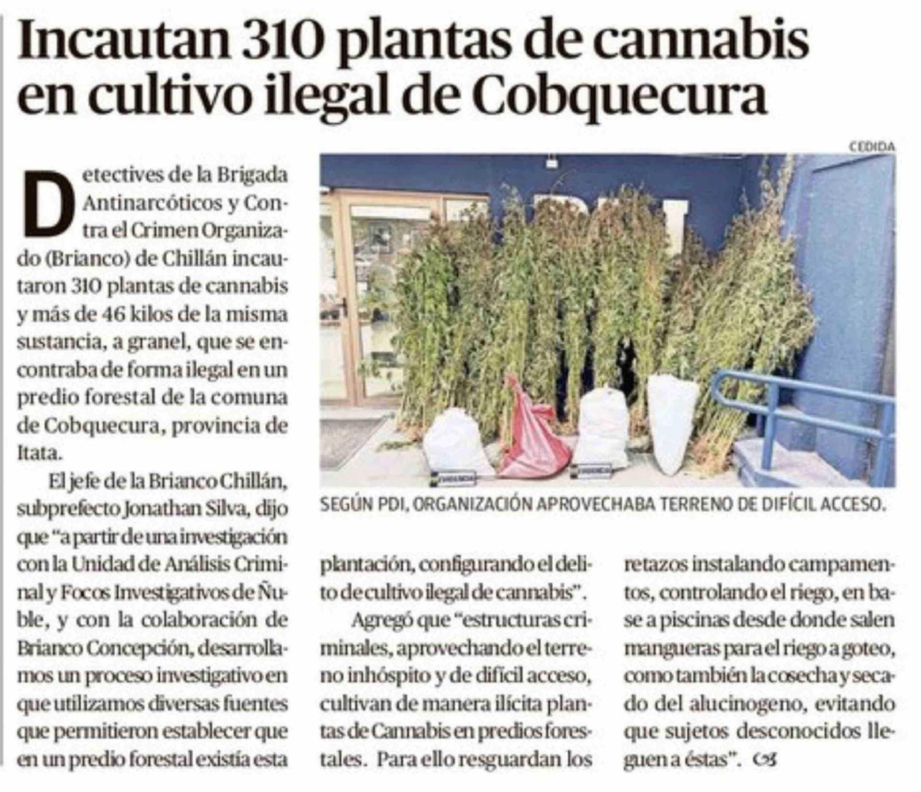 Incautan 310 plantas de cannabis en cultivo ilegal de Cobquecura