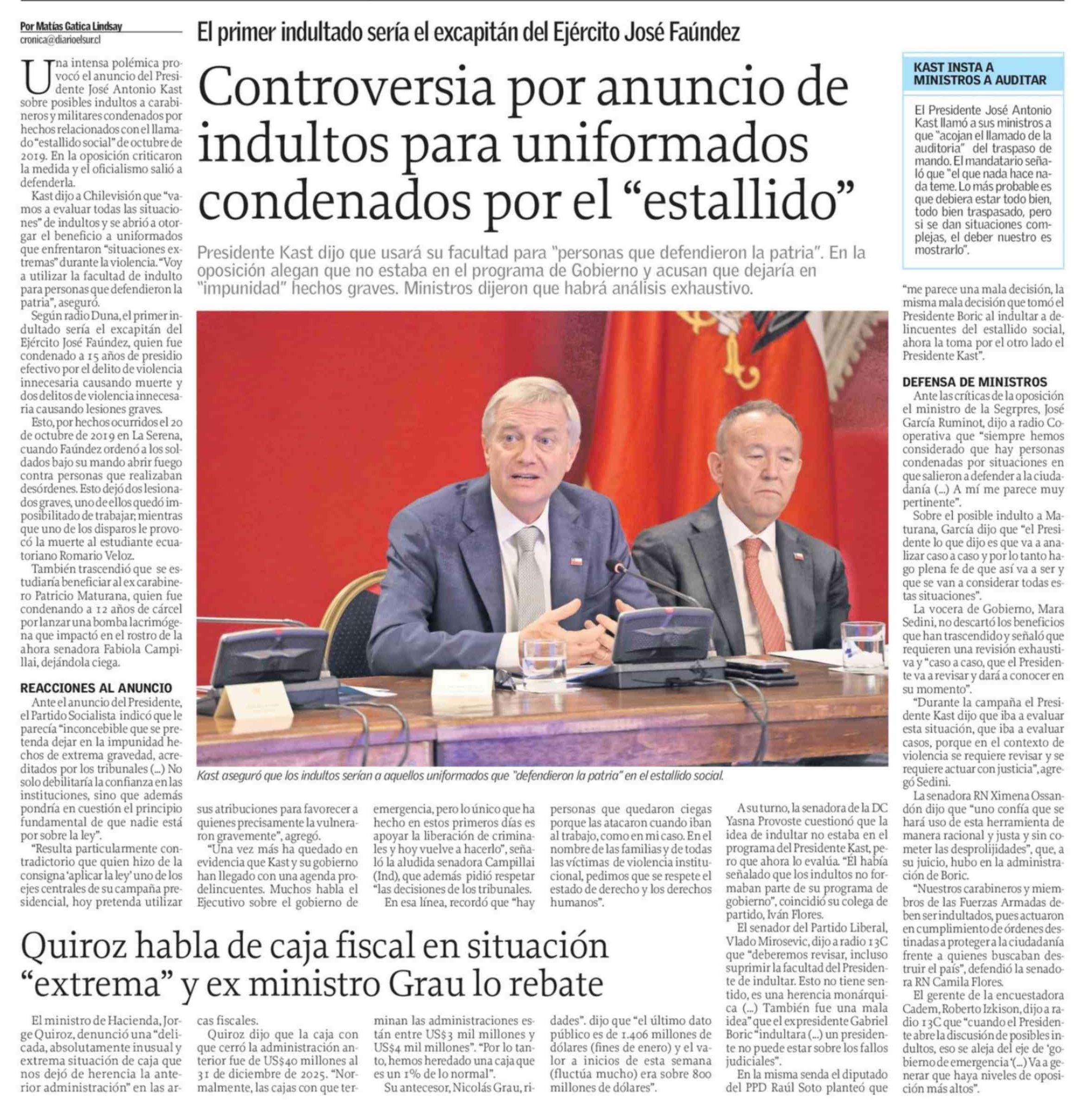 Controversia por anuncio de indultos para uniformados condenados por el "estallido"