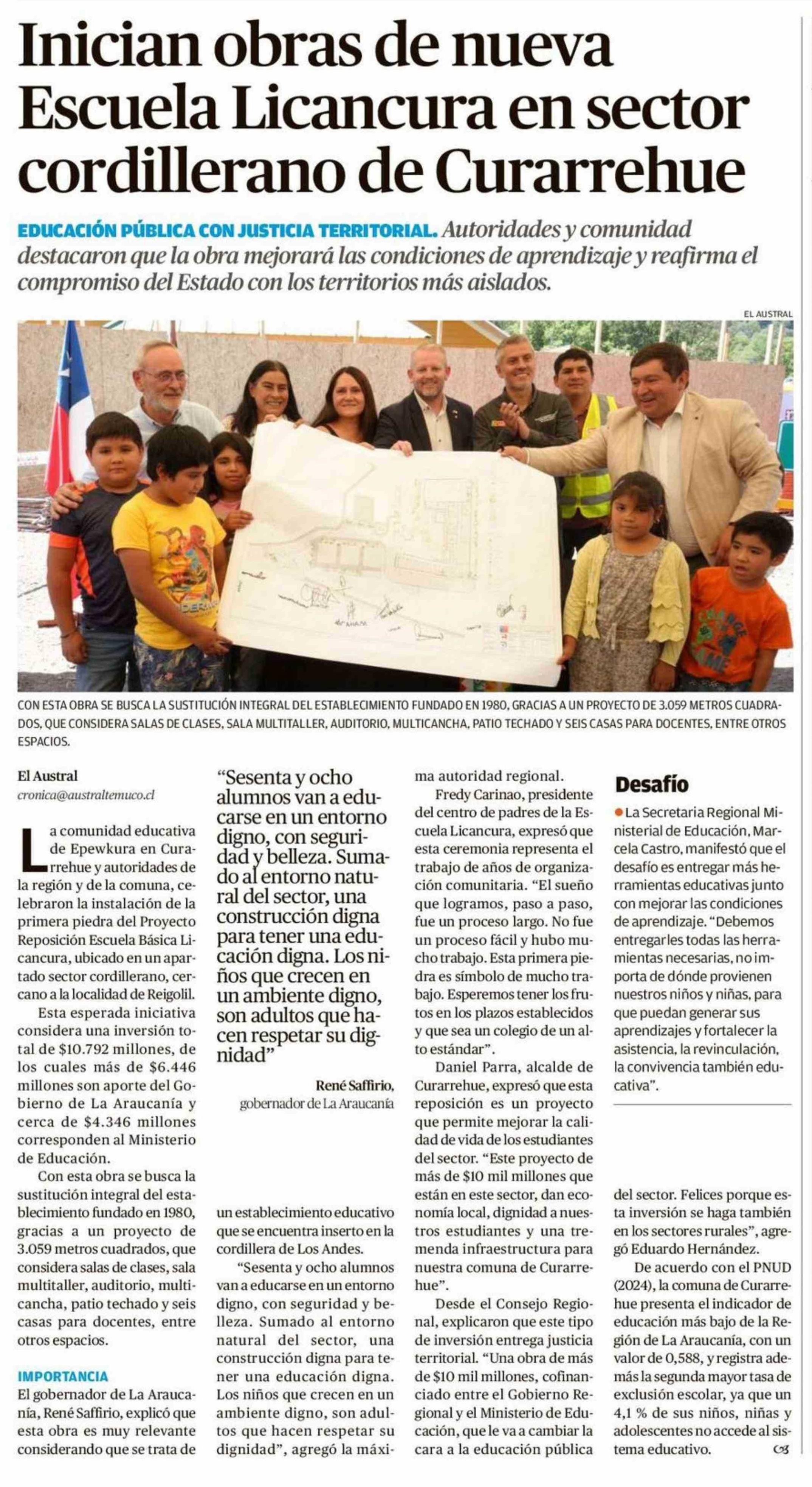 Inician obras de nueva Escuela Licancura en sector cordillerano de Curarrehue