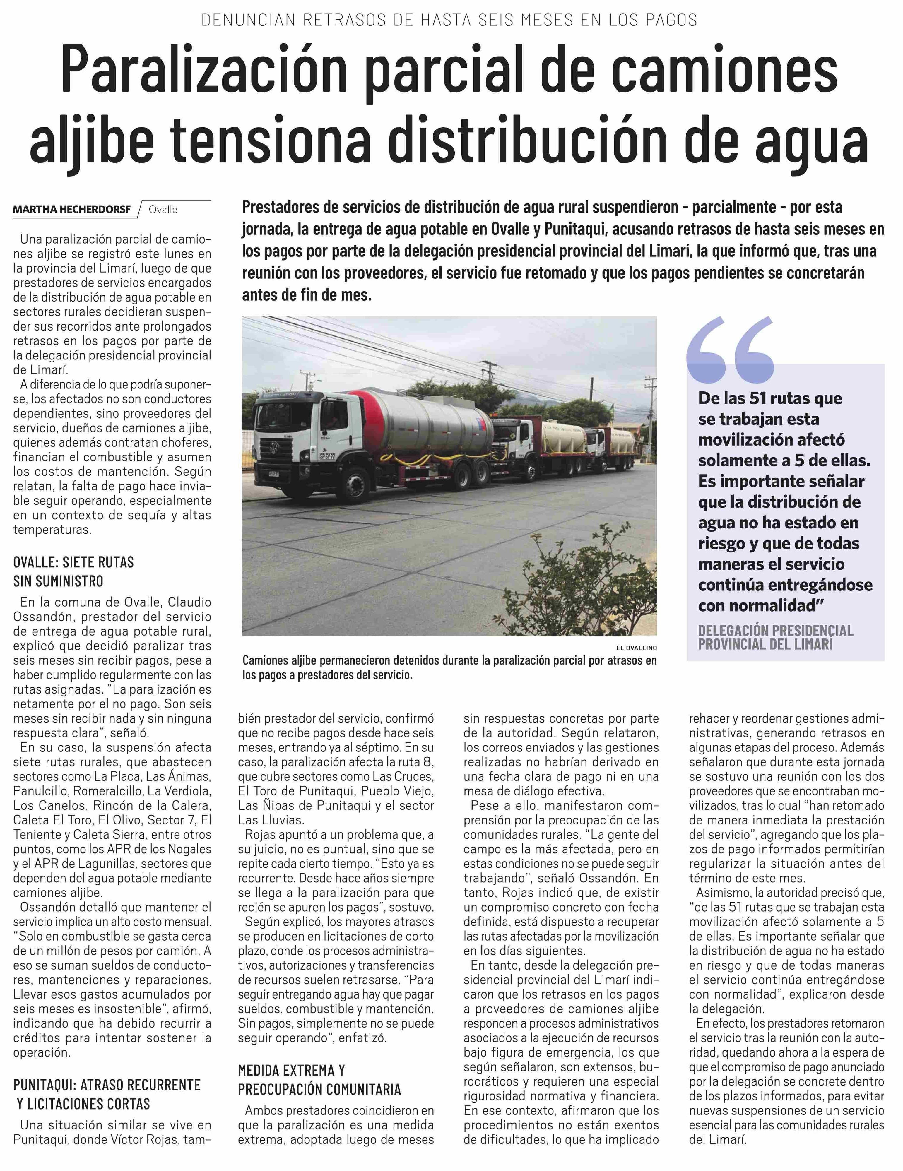 Paralización parcial de camiones aljibe tensiona distribución de agua
