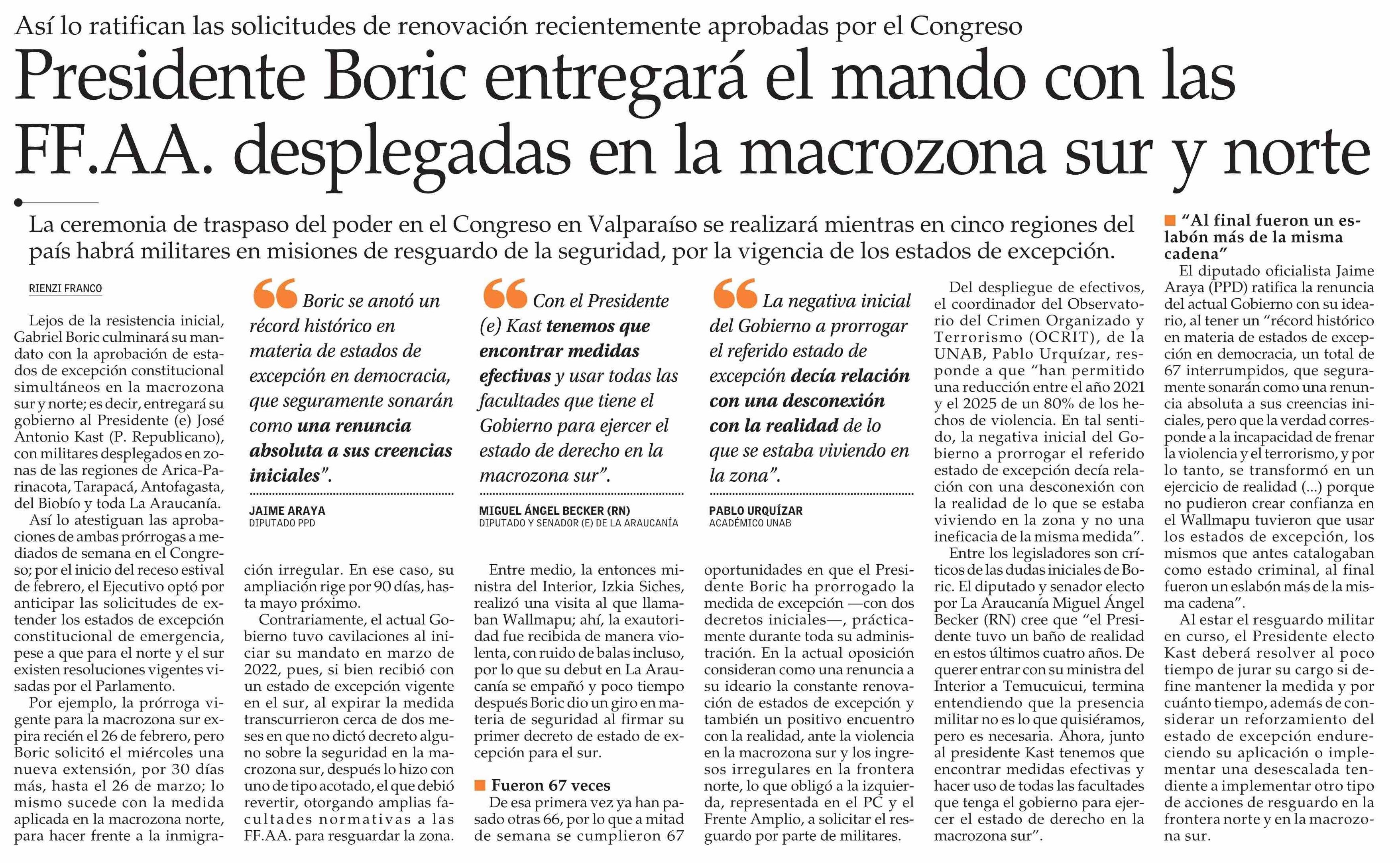 Presidente Boric entregará el mando con las FF.AA. desplegadas en la macrozona sur y norte