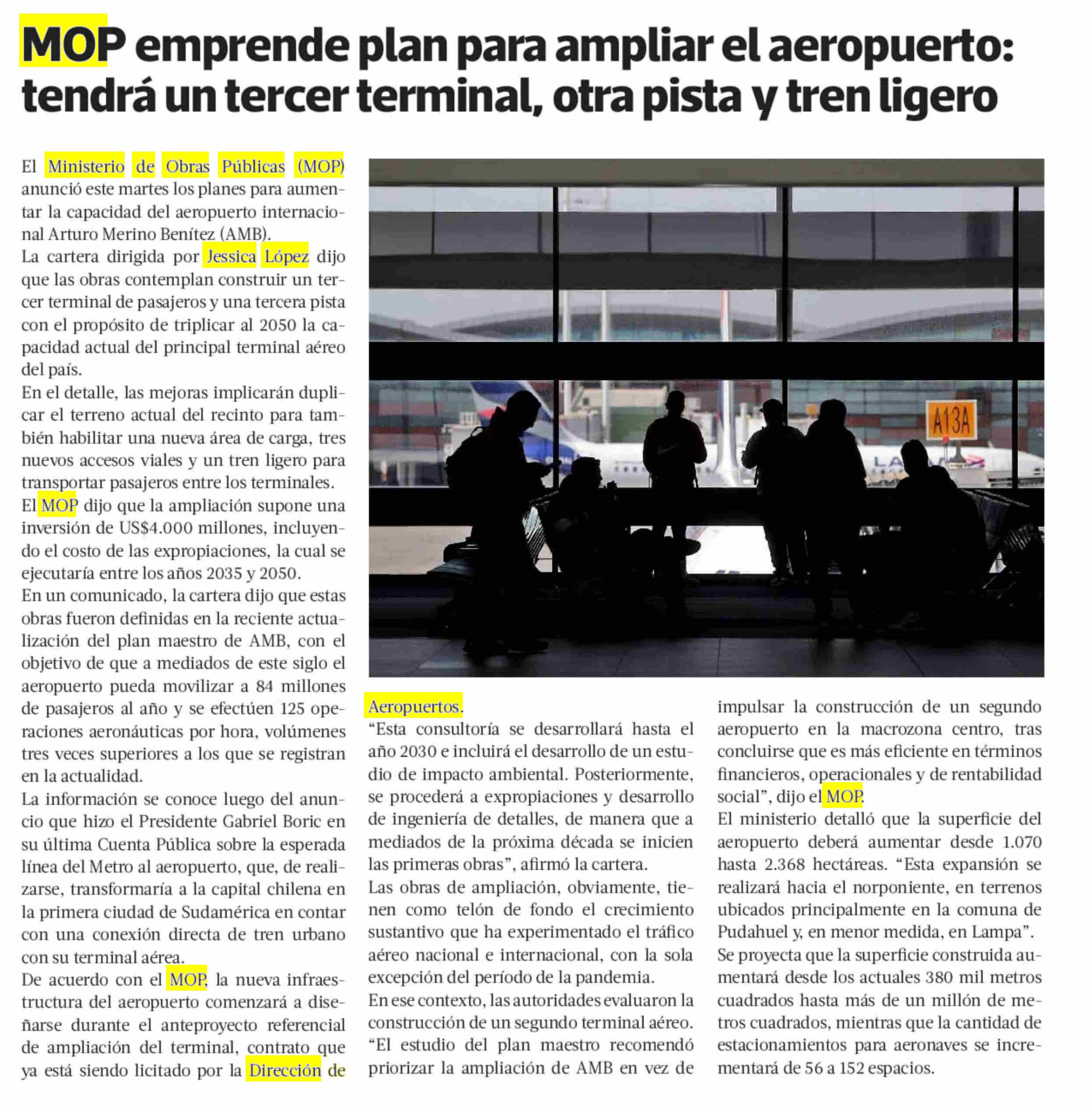Título: MOP emprende plan para ampliar el aeropuerto: tendrá un tercer terminal, otra pista y tren ligero