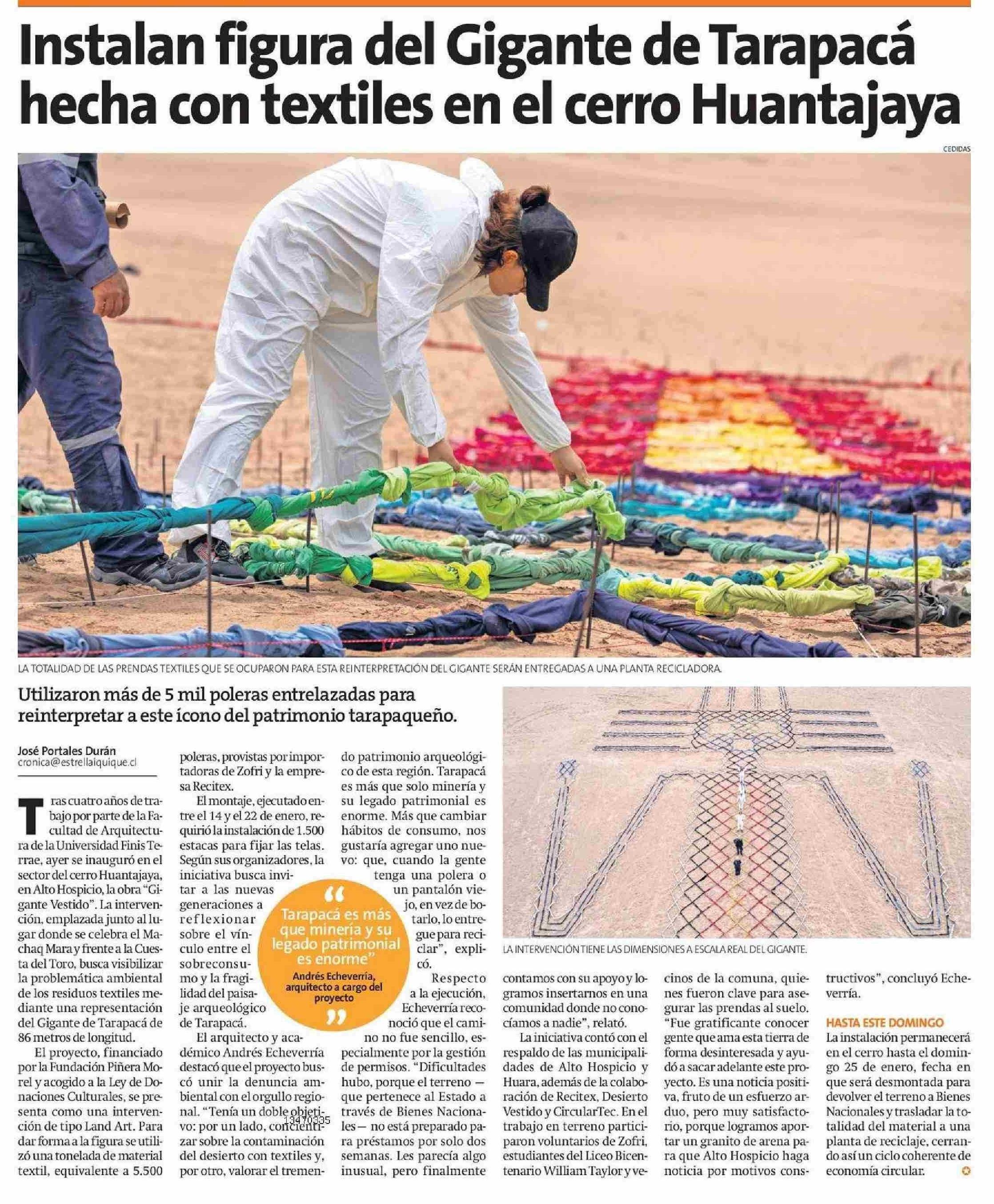 Instalan figura del Gigante de Tarapacá hecha con textiles en el cerro Huantajaya