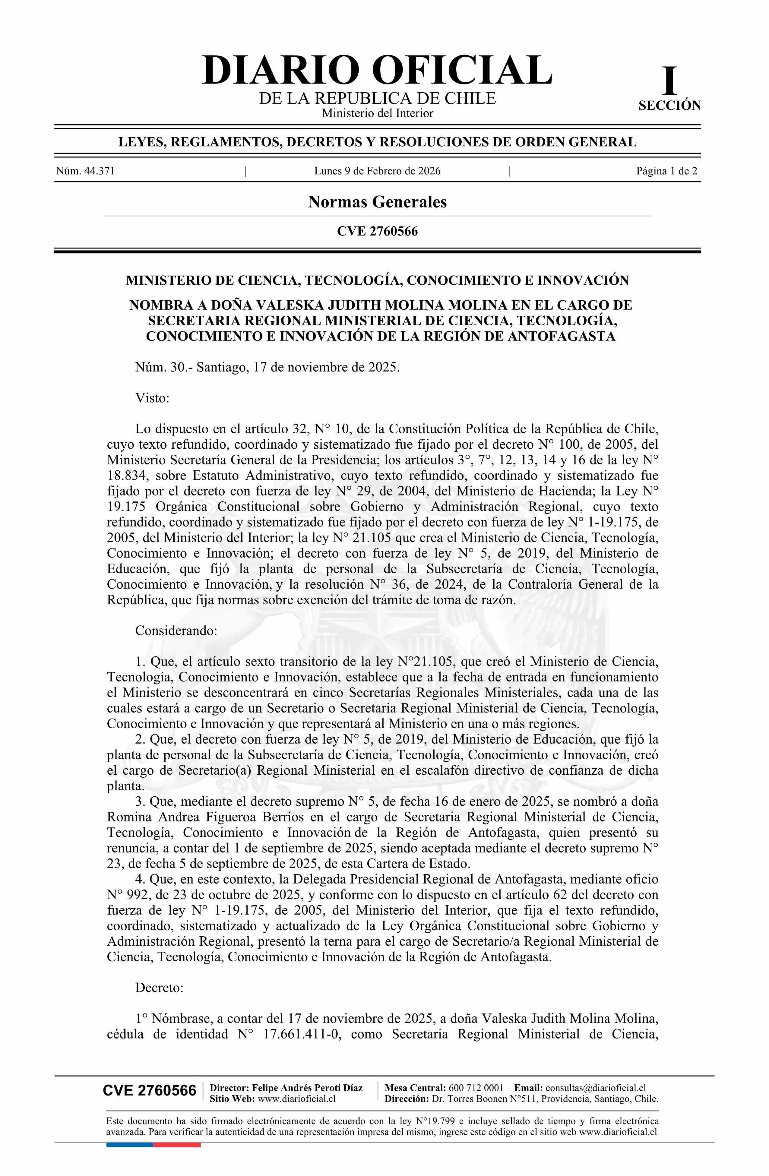 Título: Decreto número 30, de 2025.- Nombra a doña Valeska Judith Molina Molina en el cargo de Secretaria Regional Ministerial de Ciencia, Tecnología, Conocimiento e Innovación de la Región de Antofagasta
