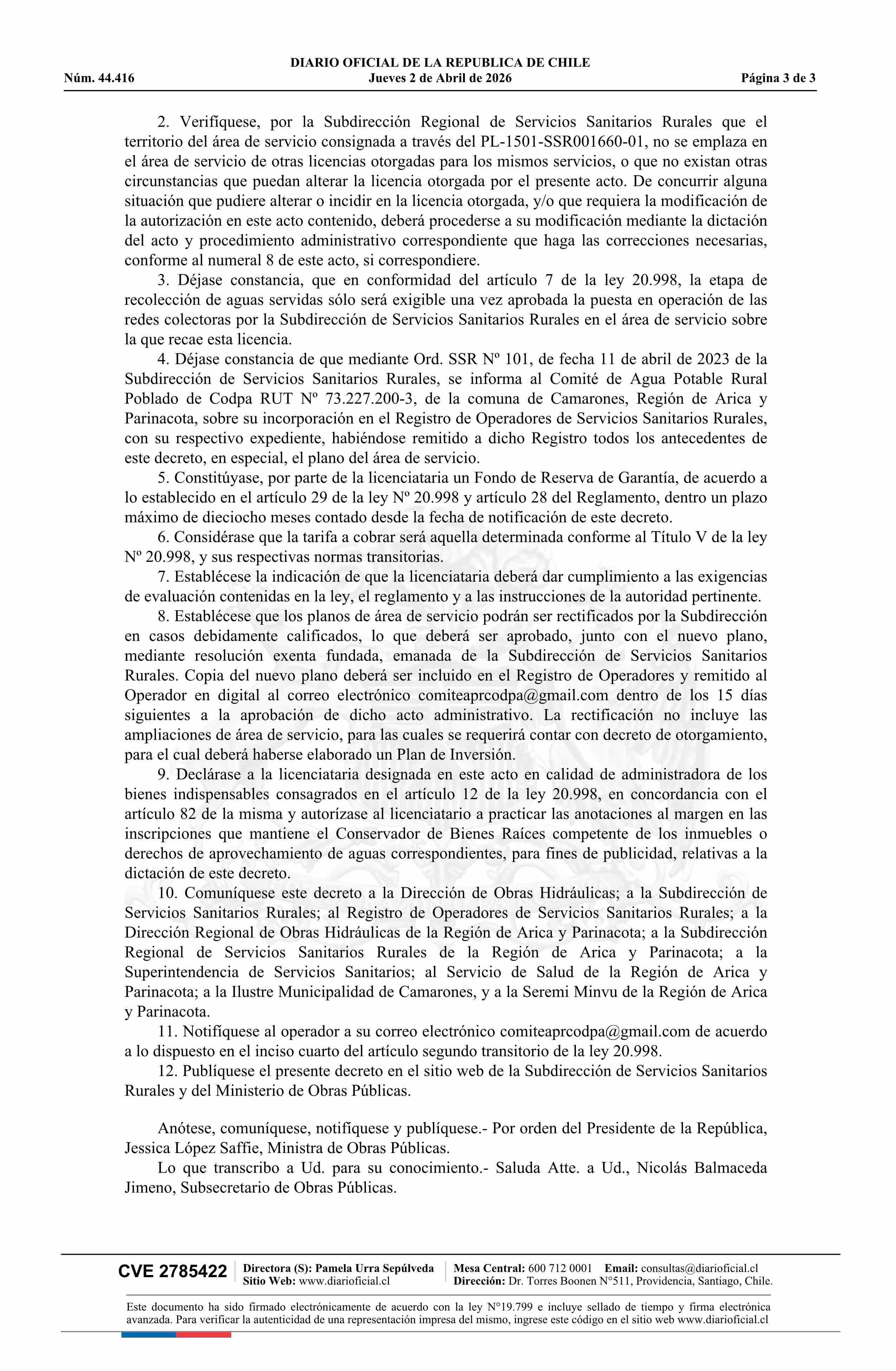 Título: Decreto exento número 47, de 2026.- Reconoce Licencia de Servicio Sanitario Rural al Comité de Agua Potable Rural Poblado de Codpa, comuna de Camarones, provincia de Arica, Región de Arica y Parinacota, y da cuenta de su registro como operador