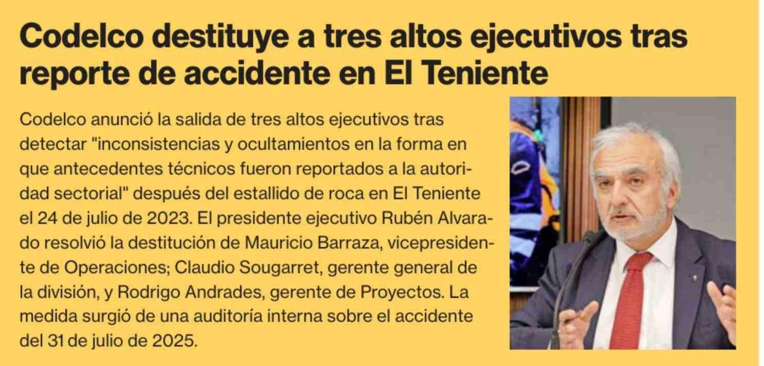 Codelco destituye a tres altos ejecutivos tras reporte de accidente en El Teniente