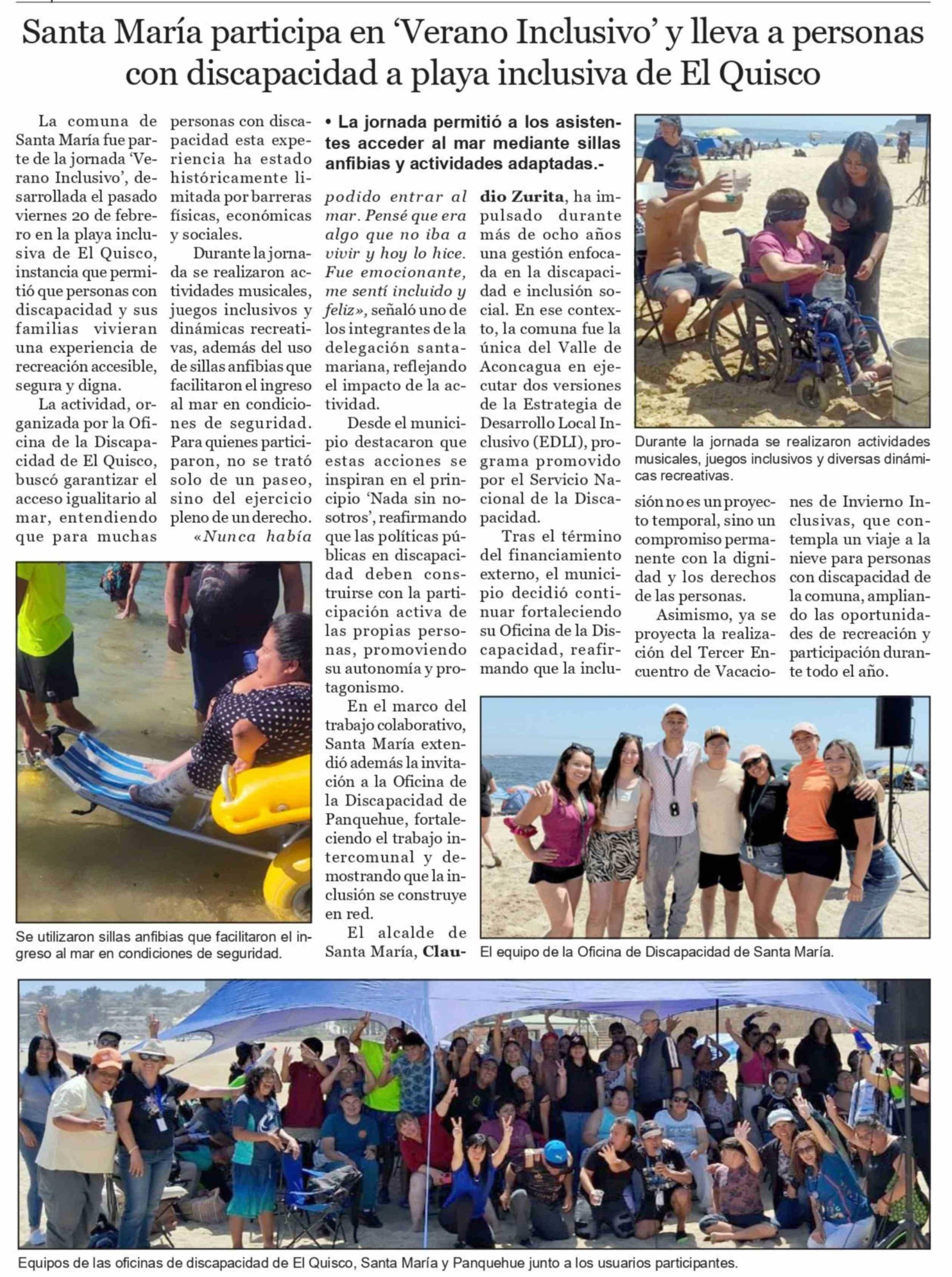 Santa María participa en 'Verano Inclusivo' y lleva a personas con discapacidad a playa inclusiva de El Quisco