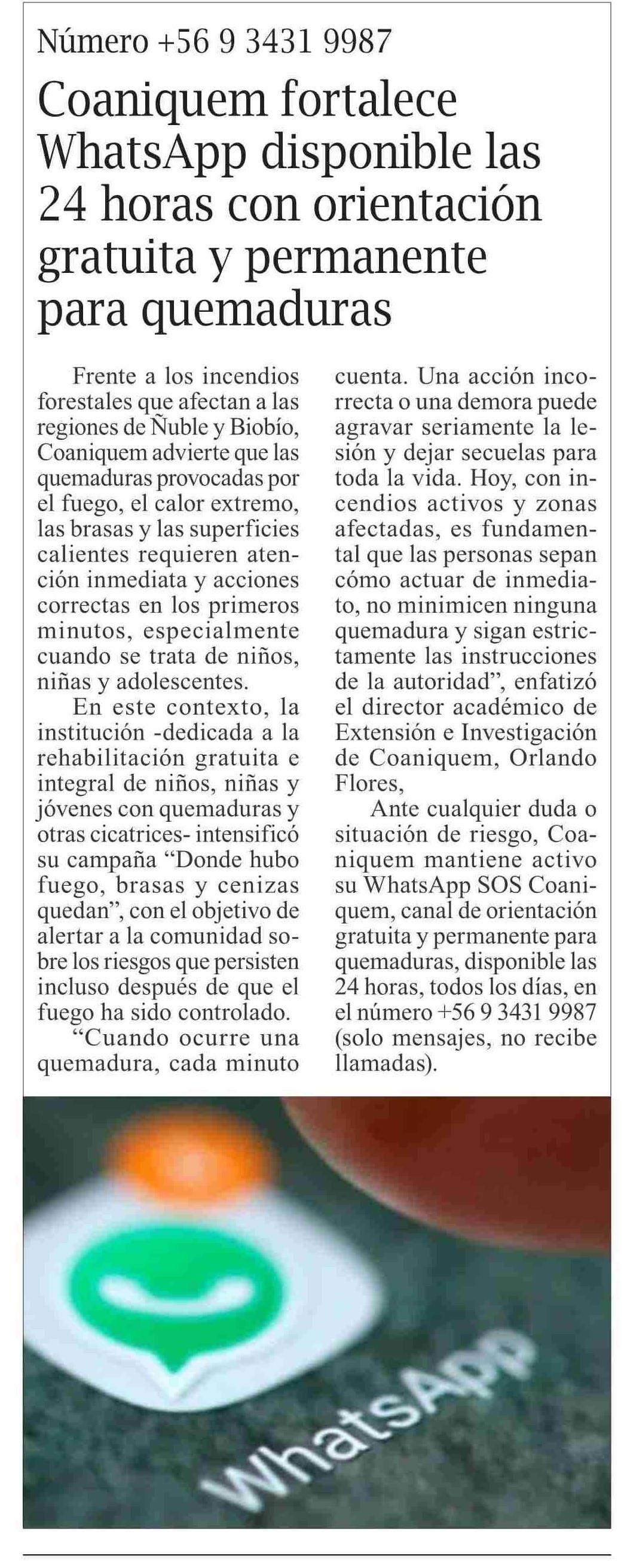 Coaniquem fortalece WhatsApp disponible las 24 horas con orientación gratuita y permanente para quemaduras