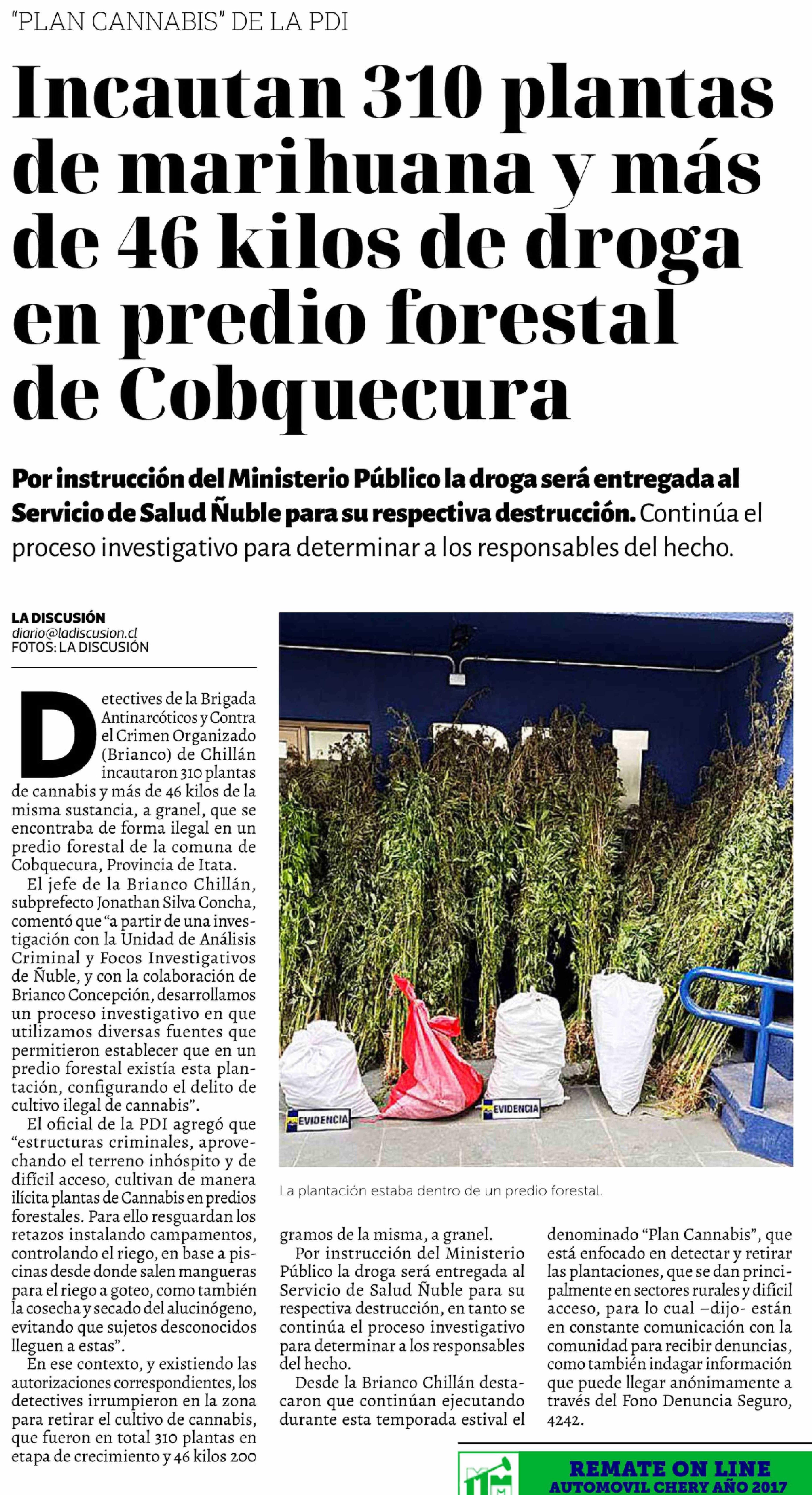 Incautan 310 plantas de marihuana y más de 46 kilos de droga en predio forestal de Cobquecura