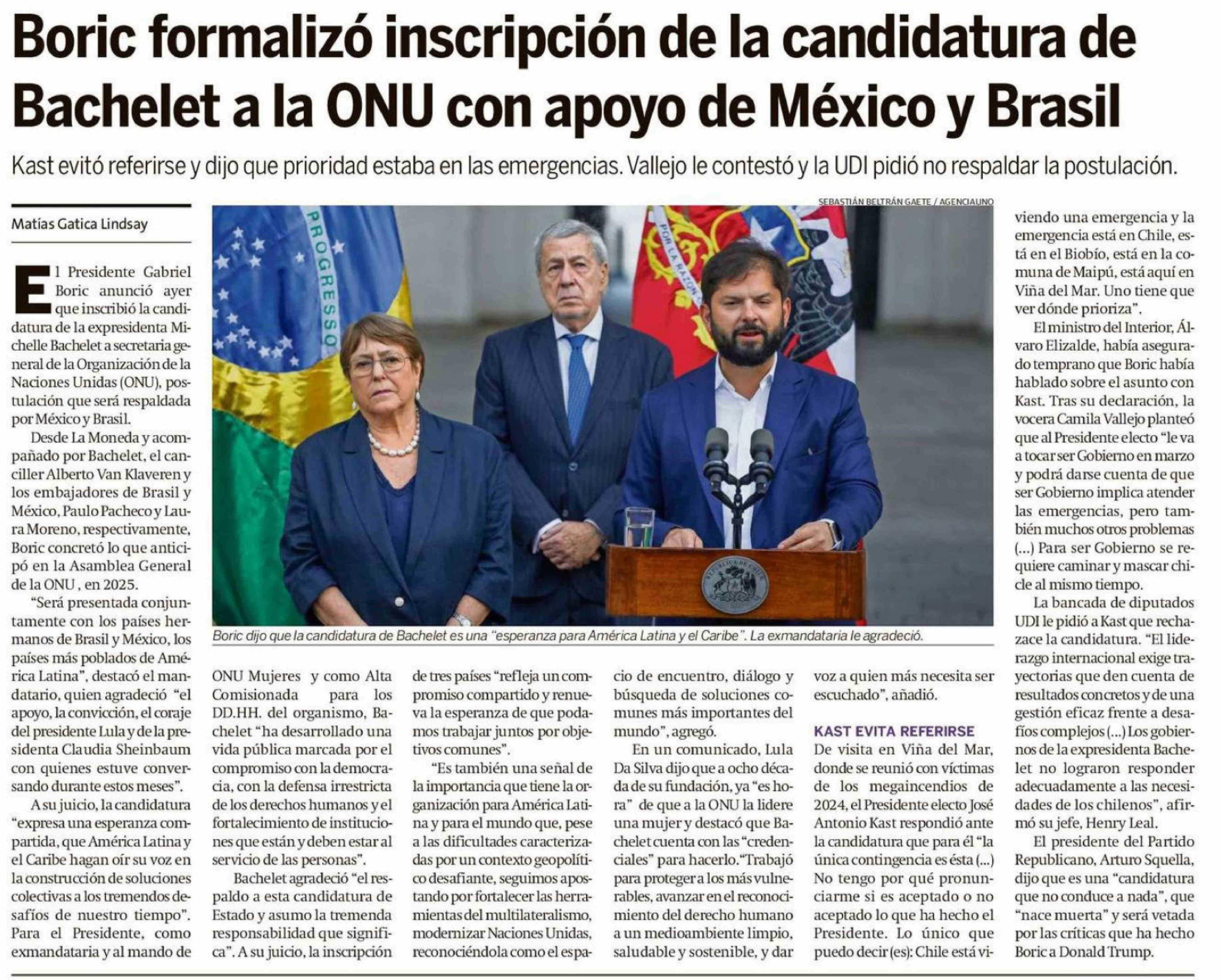 Boric formalizó inscripción de la candidatura de Bachelet a la ONU con apoyo de México y Brasil