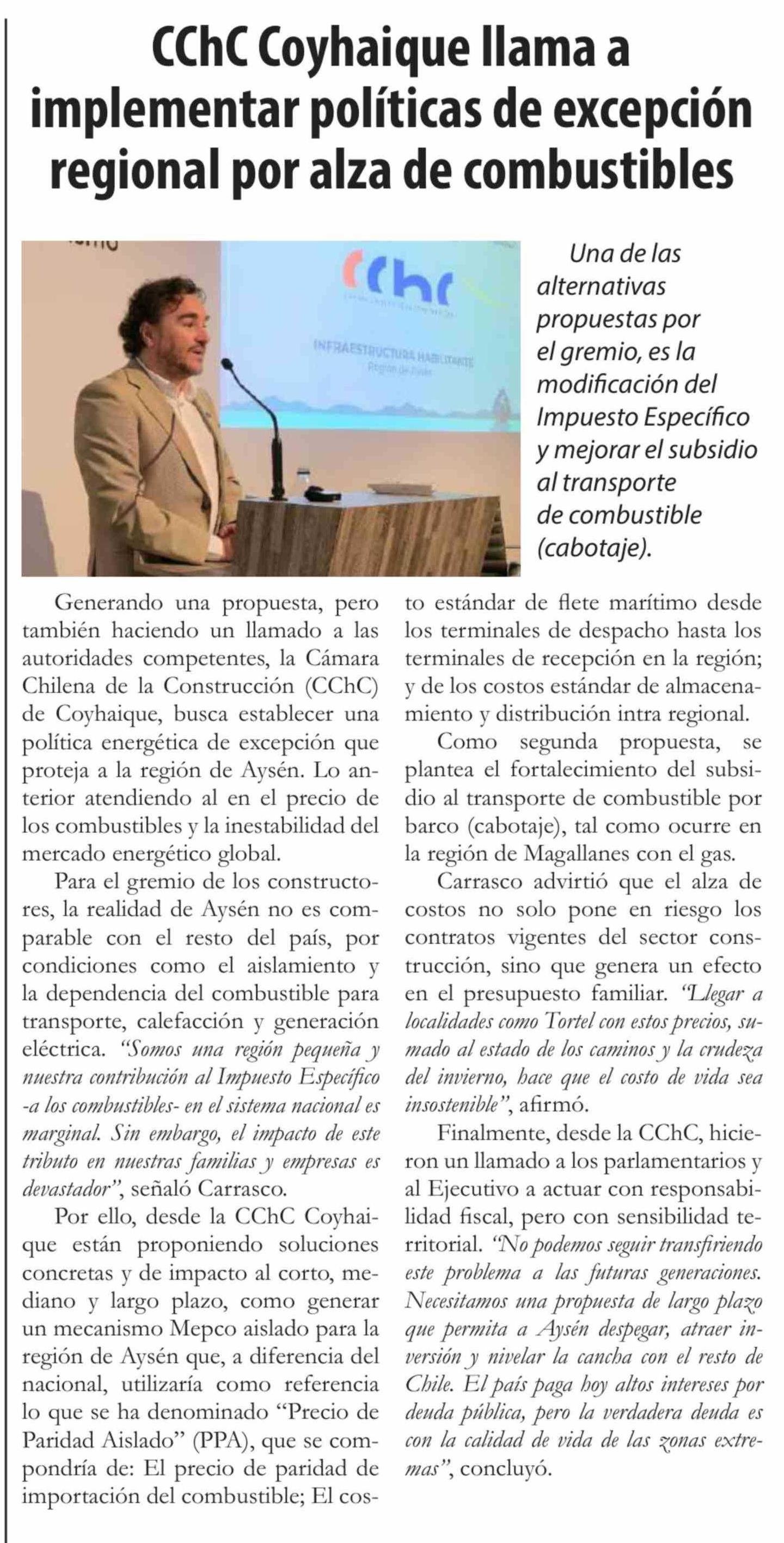 CChC Coyhaique llama a implementar políticas de excepción regional por alza de combustibles