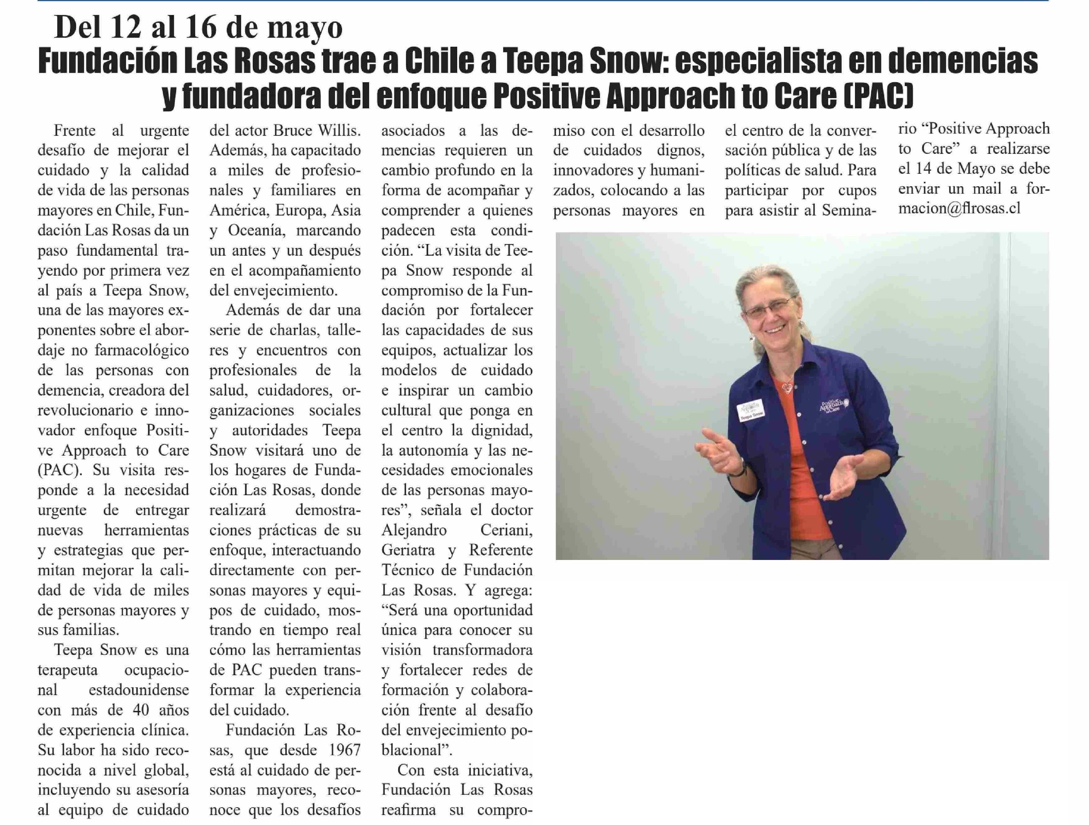 Fundación Las Rosas trae a Chile a Teepa Snow: especialista en demencias víundadora del enfoque Positive Approach to Care (PAC)