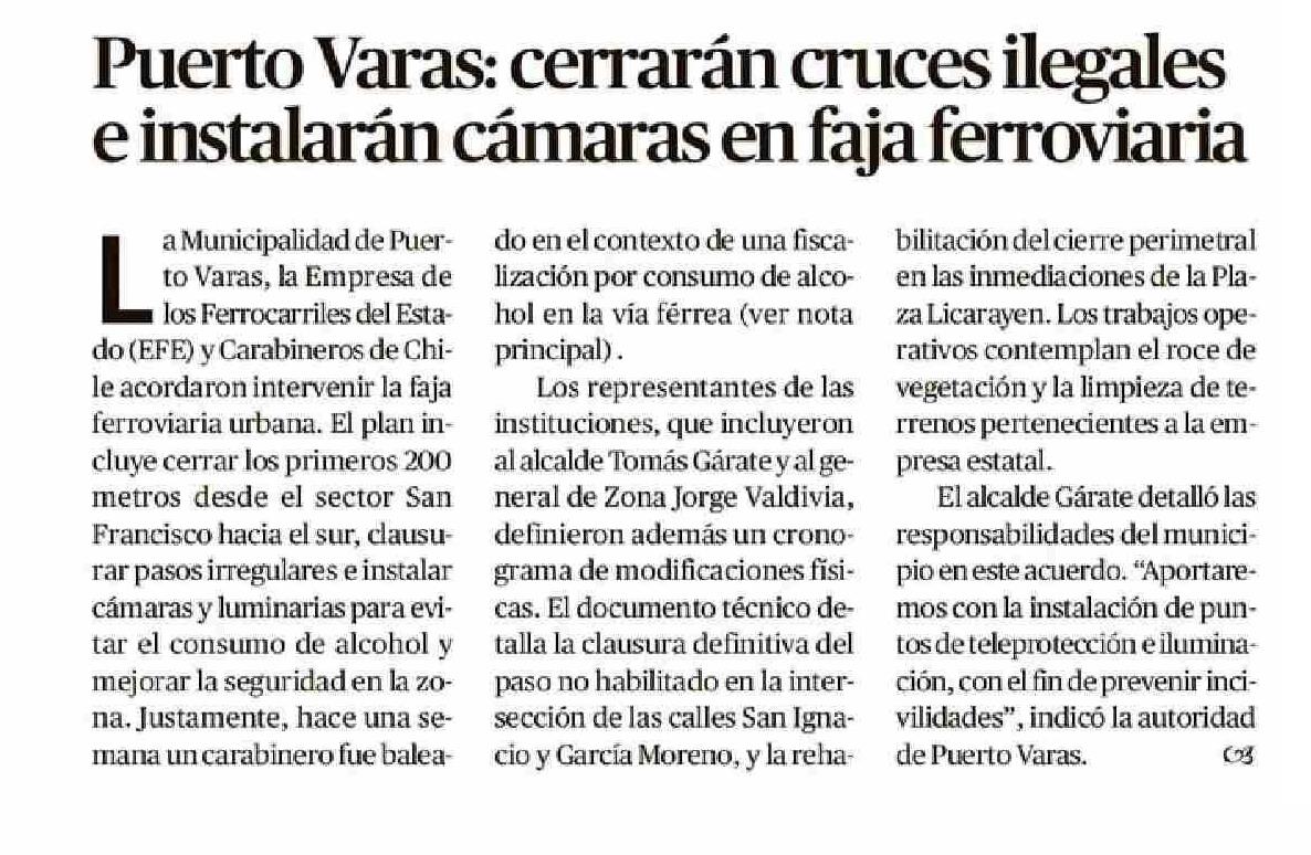 Puerto Varas: cerrarán cruces ilegales einstalarán cámaras en faja ferroviaria