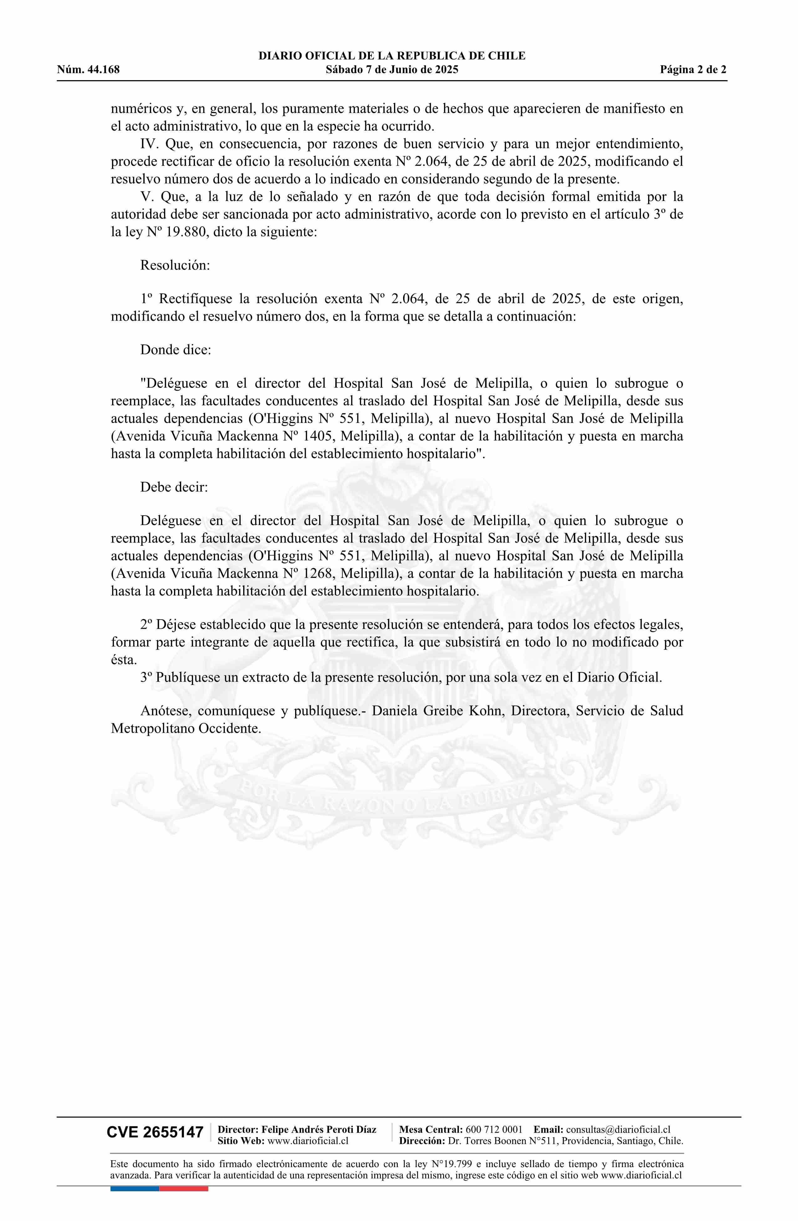 | Título: | Resolución exenta número 2.591, de 2025.- Rectifica resolución Nº 2.064 exenta, 2025, que delega facultades que indica, en Director de Hospital San José de Melipilla |