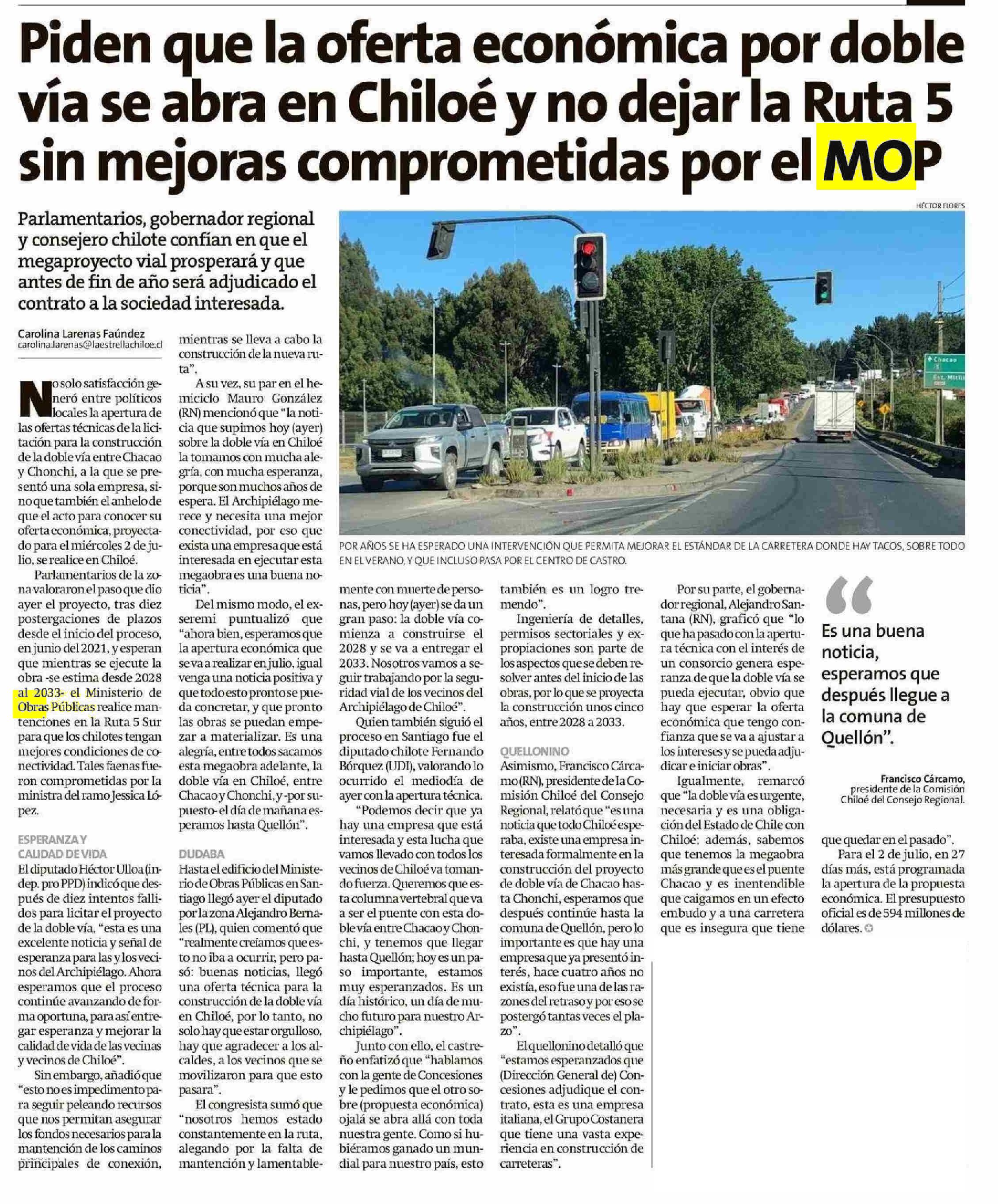 Piden que la oferta económica por doble via se abra en Chiloé y no dejar la Ruta 5 sin mejoras comprometidas por el MOP