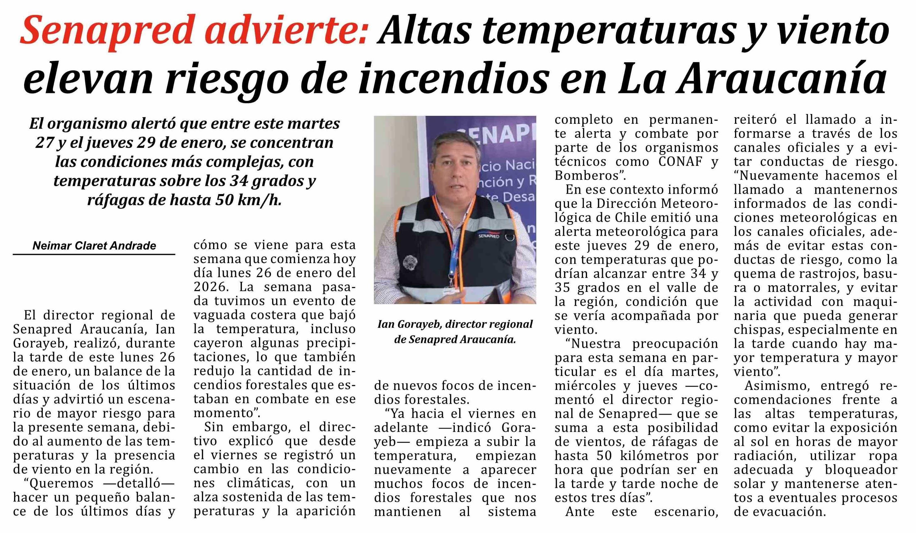 Senapred advierte: Altas temperaturas y viento elevan riesgo de incendios en La Araucanía
