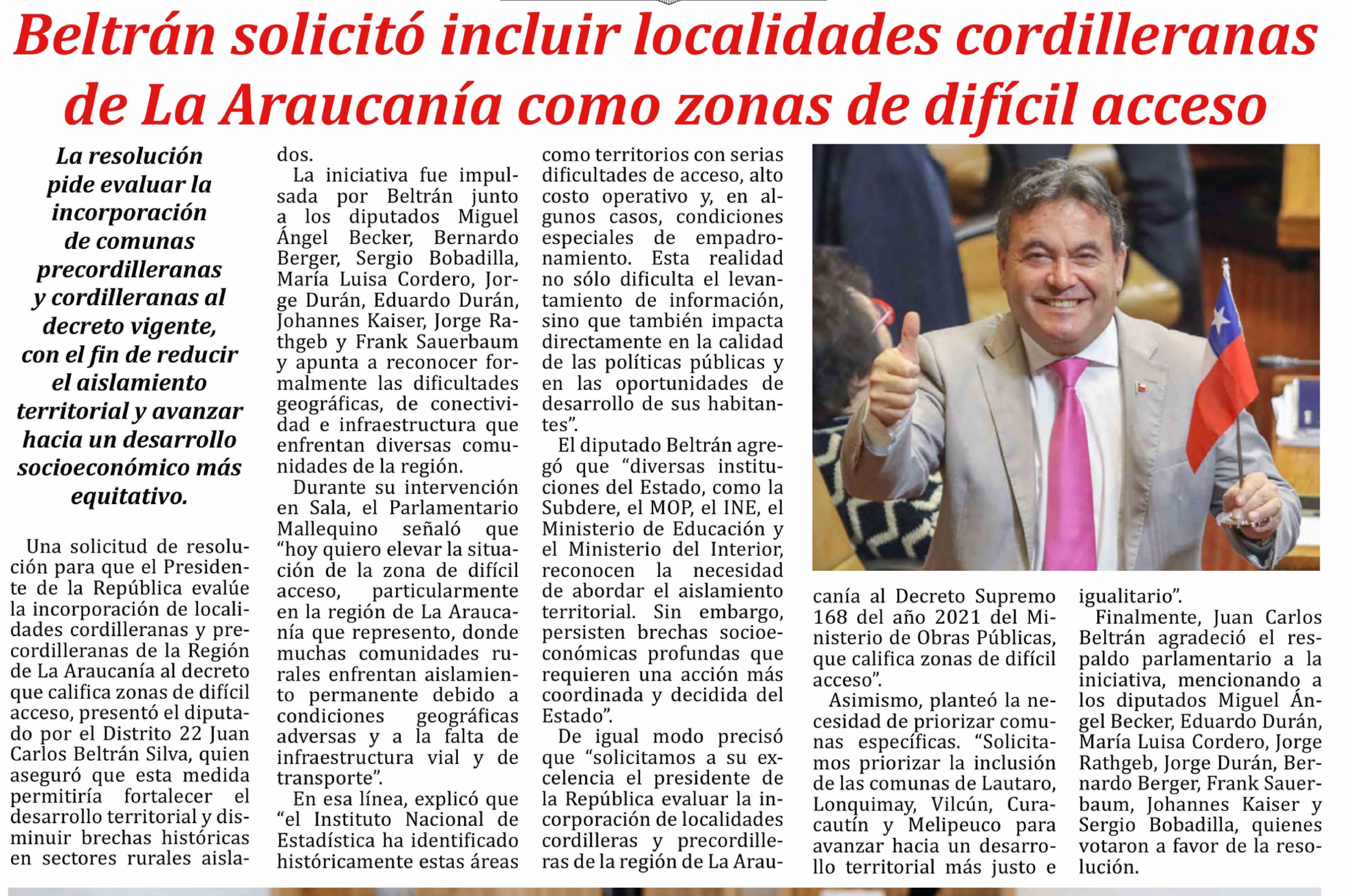 Beltrán solicitó incluir localidades cordilleranas de La Araucanía como zonas de difícil acceso