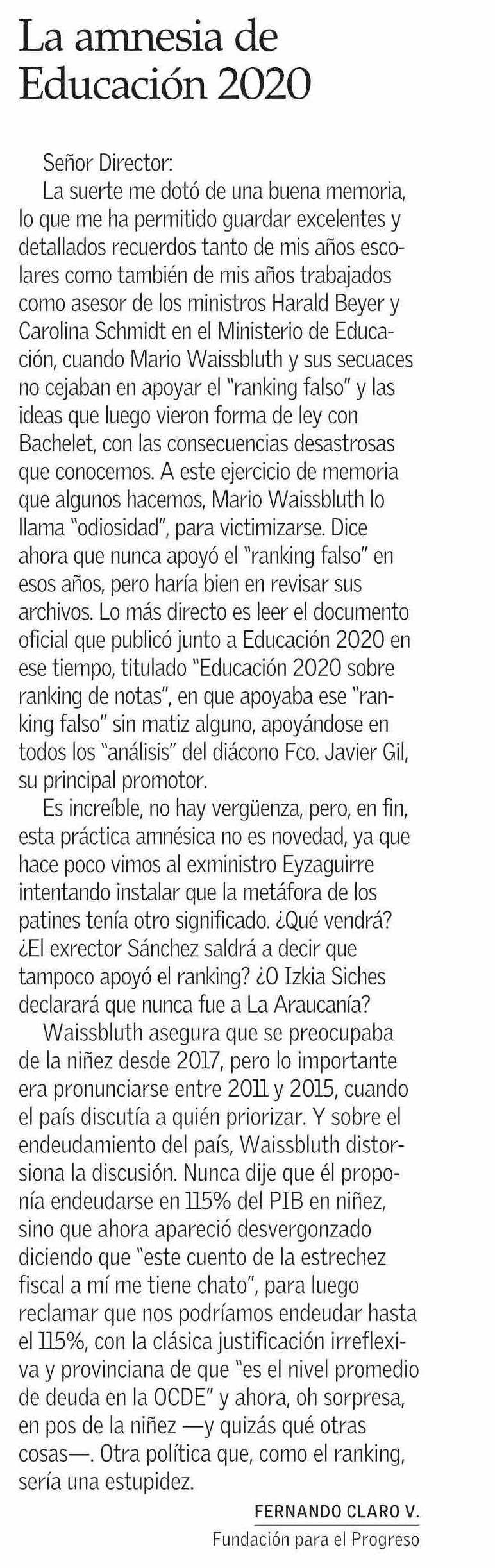 CARTAS: La amnesia de Educación 2020