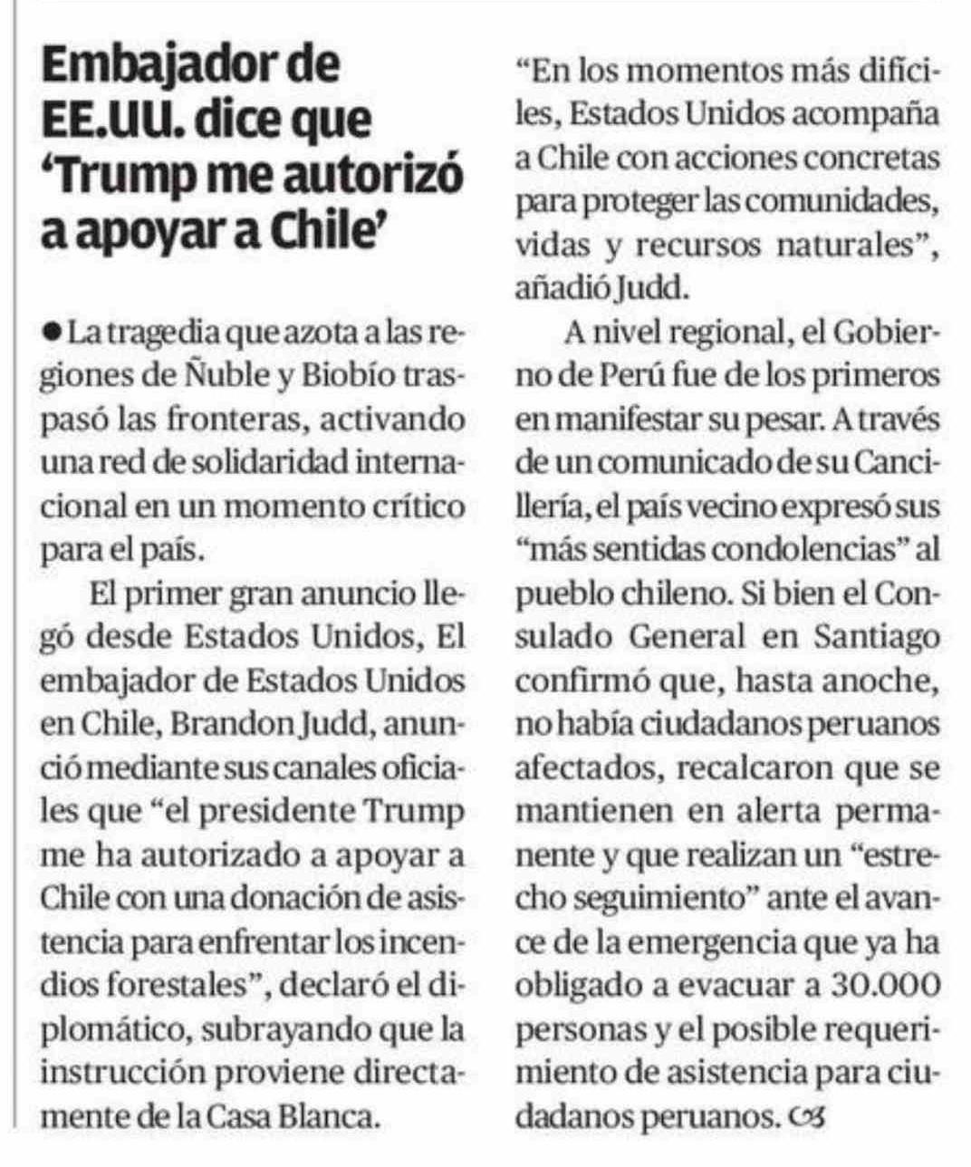 | Título: | · La tragedia que azota a las regiones de Ñuble y Biobío traspasó las fronteras, activando una red de solidaridad internacional en un momento crítico para el país. El primer gran anuncio llegó desde Estados Unidos, El embajador de Estados Unidos en Chile, Brandon Judd, anunció mediante sus canales o |