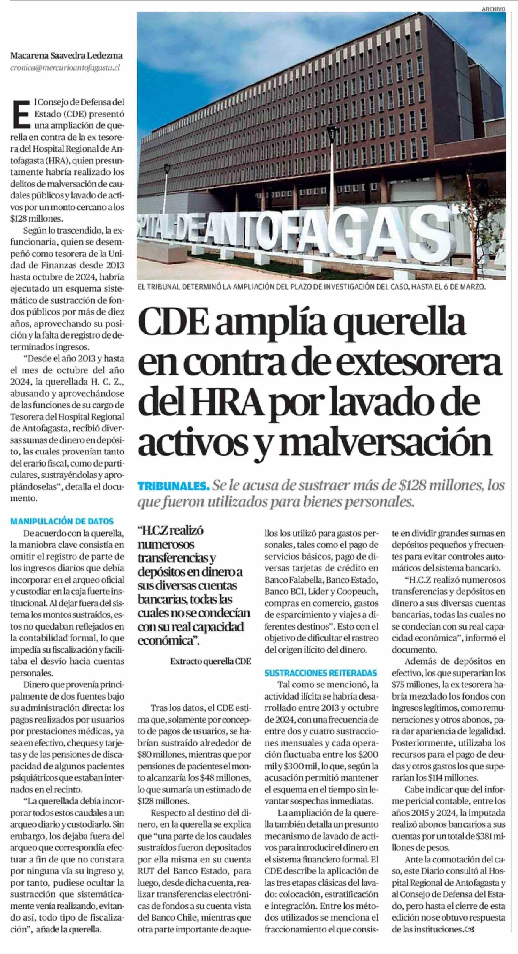 CDE amplía querella en contra de extesorera del HRA por lavado de activos y malversación