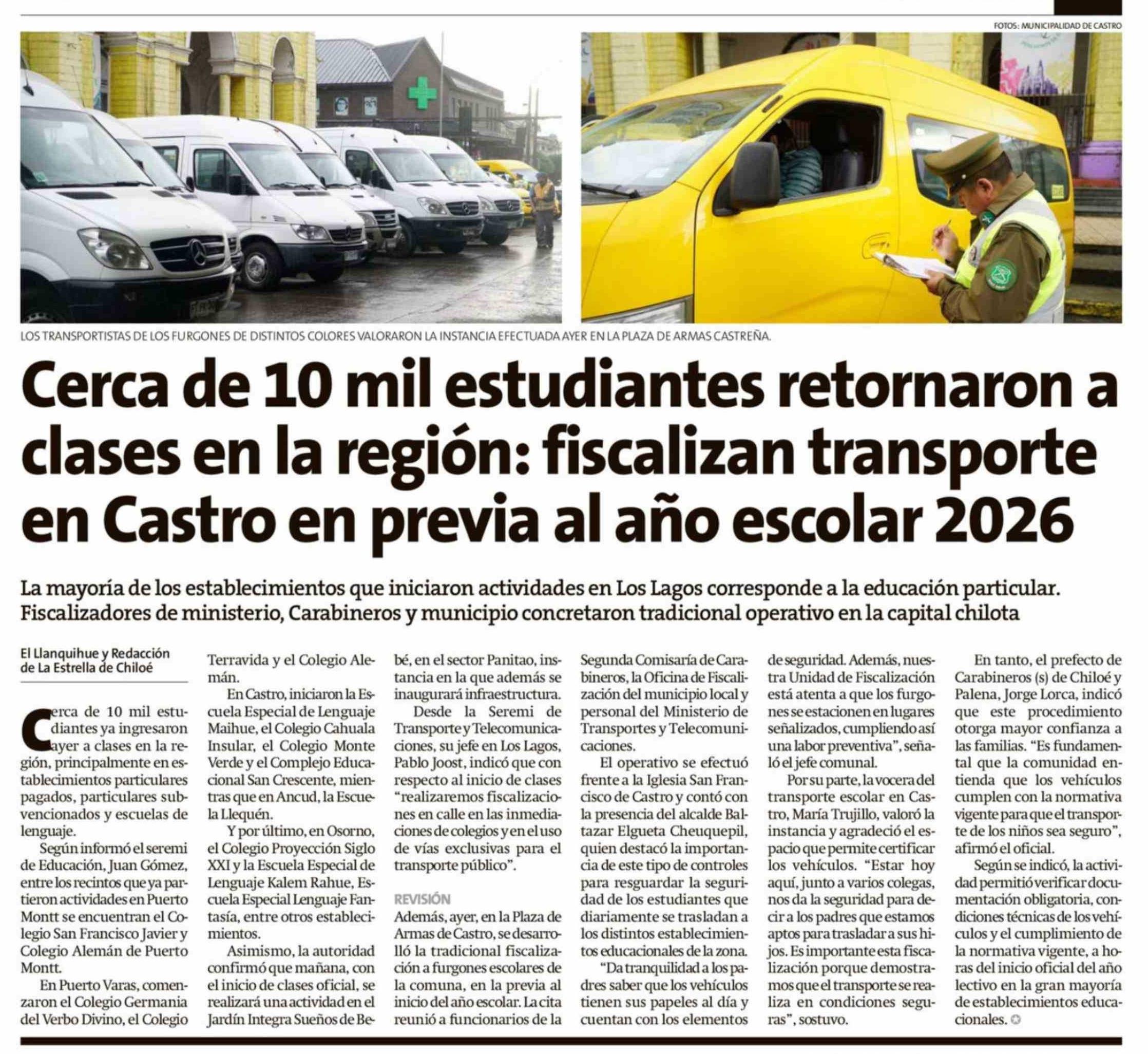 Cerca de 10 mil estudiantes retornaron a clases en la región: fiscalizan transporte en Castro en previa al año escolar 2026