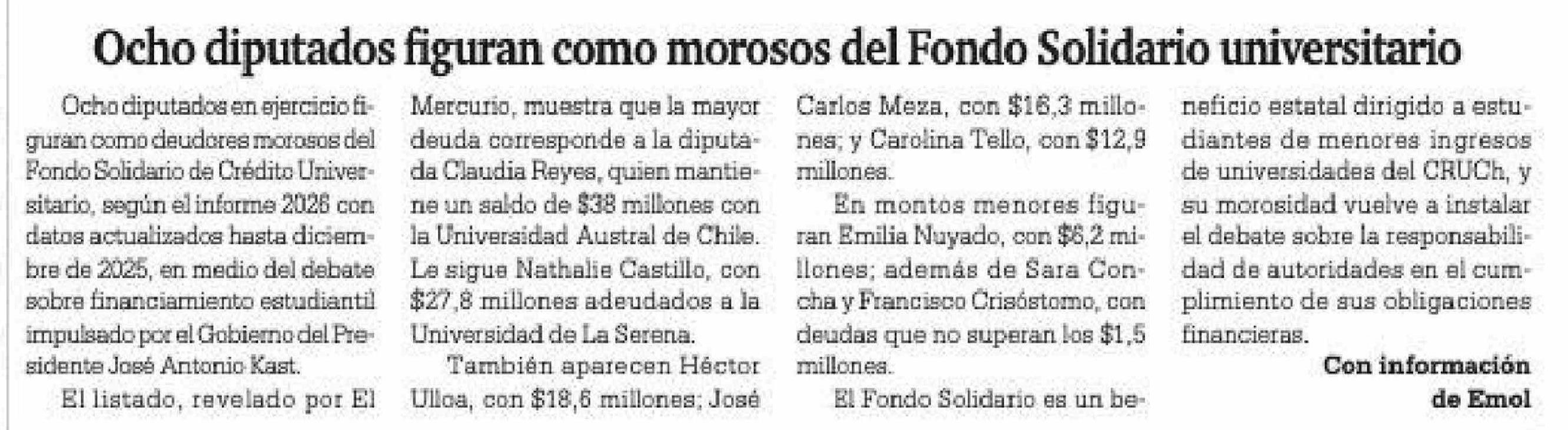 Ocho diputados figuran como morosos del Fondo Solidario universitario