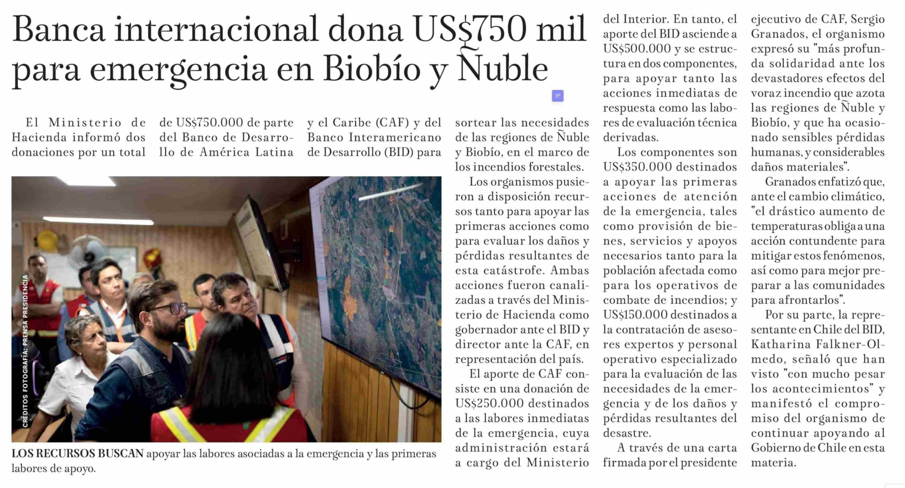 Banca internacional dona US$750 mil para emergencia en Biobío y Nuble