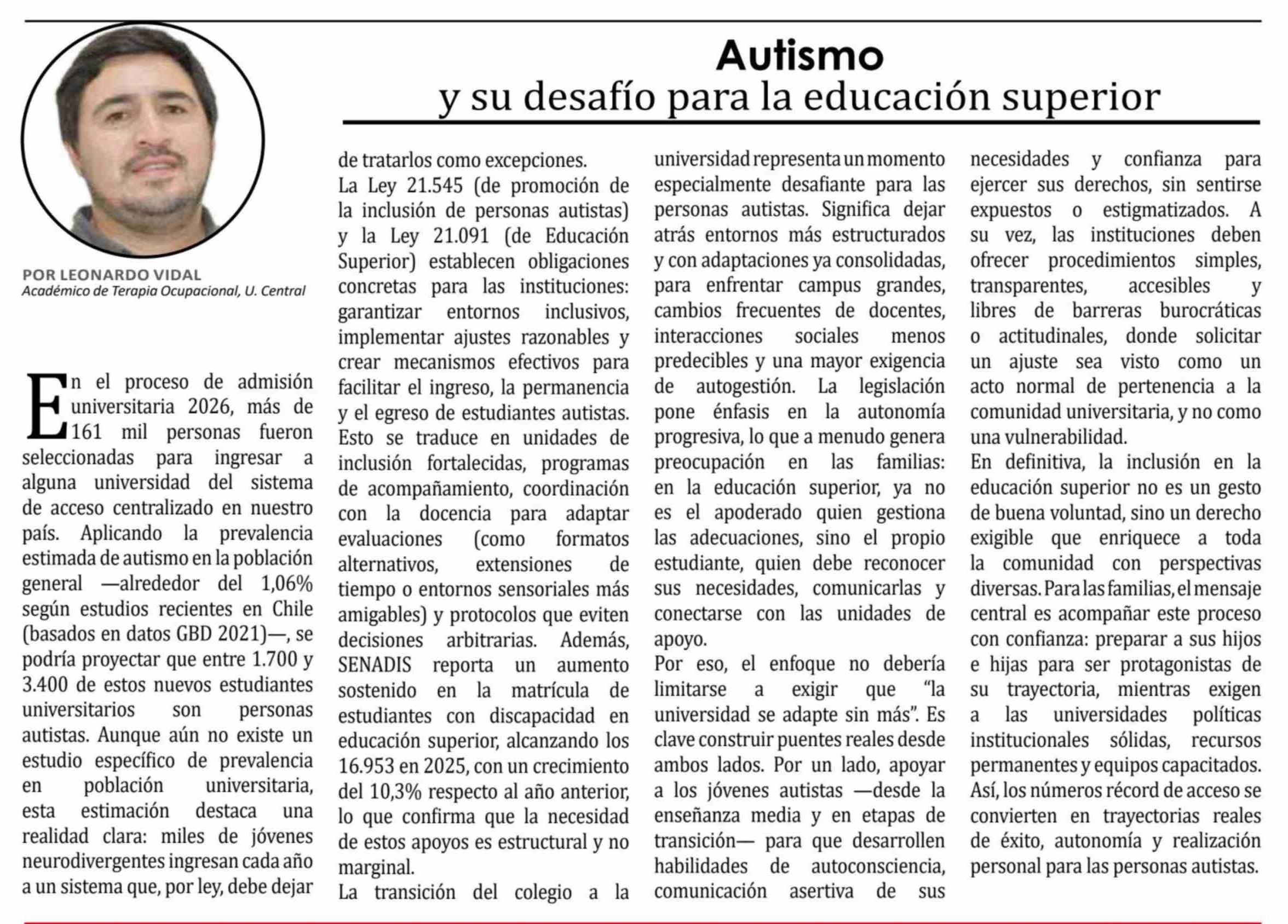 Columnas de Opinión: Autismo y su desafío para la educación superior