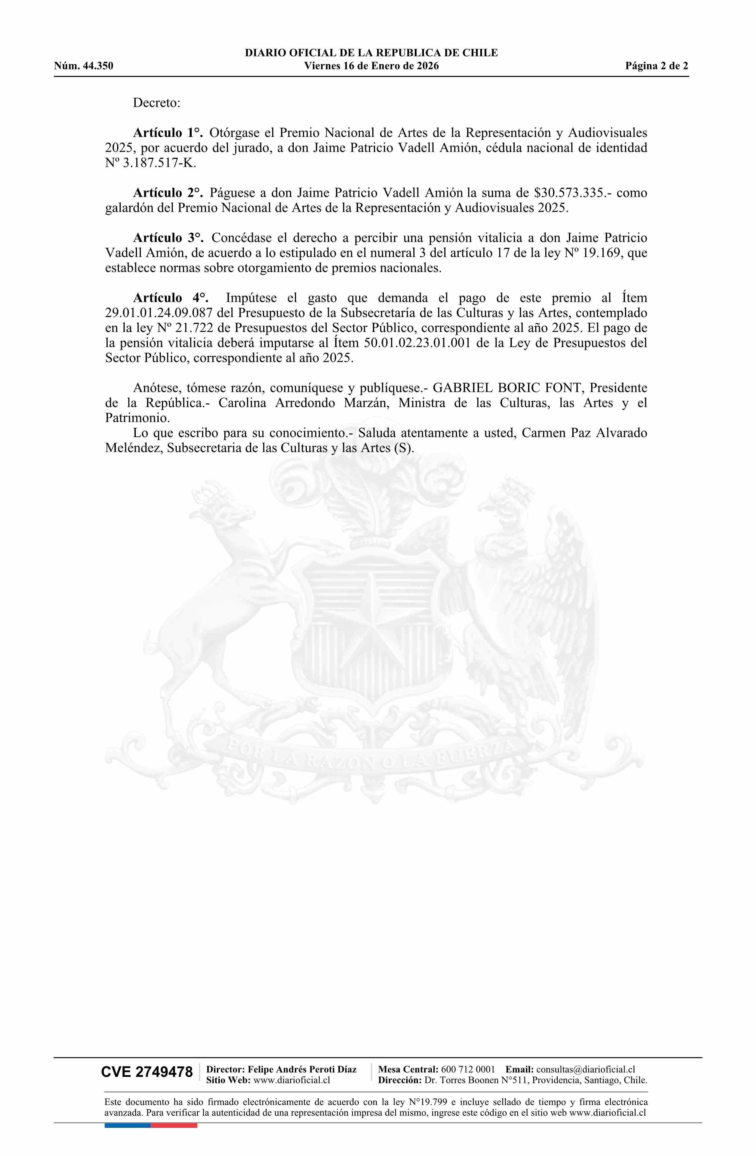 | Título: | Decreto número 45, de 2025.- Otorga Premio Nacional de Artes de la Representación y Audiovisuales 2025 a don Jaime Patricio Vadell Amión |